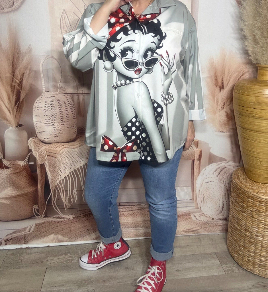 Chemise ample grise rayée manches réglables Betty Boop Pin Up du 40 au 52