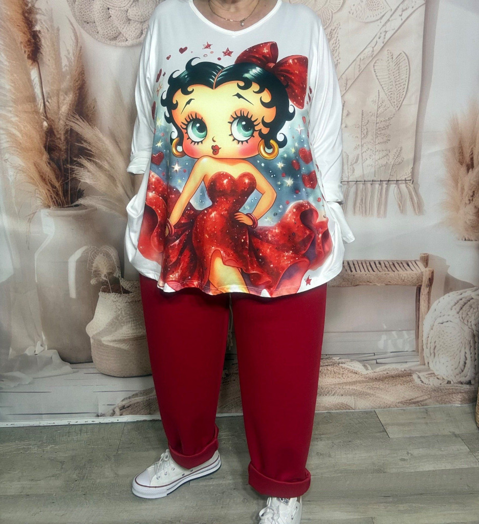 Top trapèze blanc manches longues Betty Boop Pinup rétro chic du 42 au 56/58