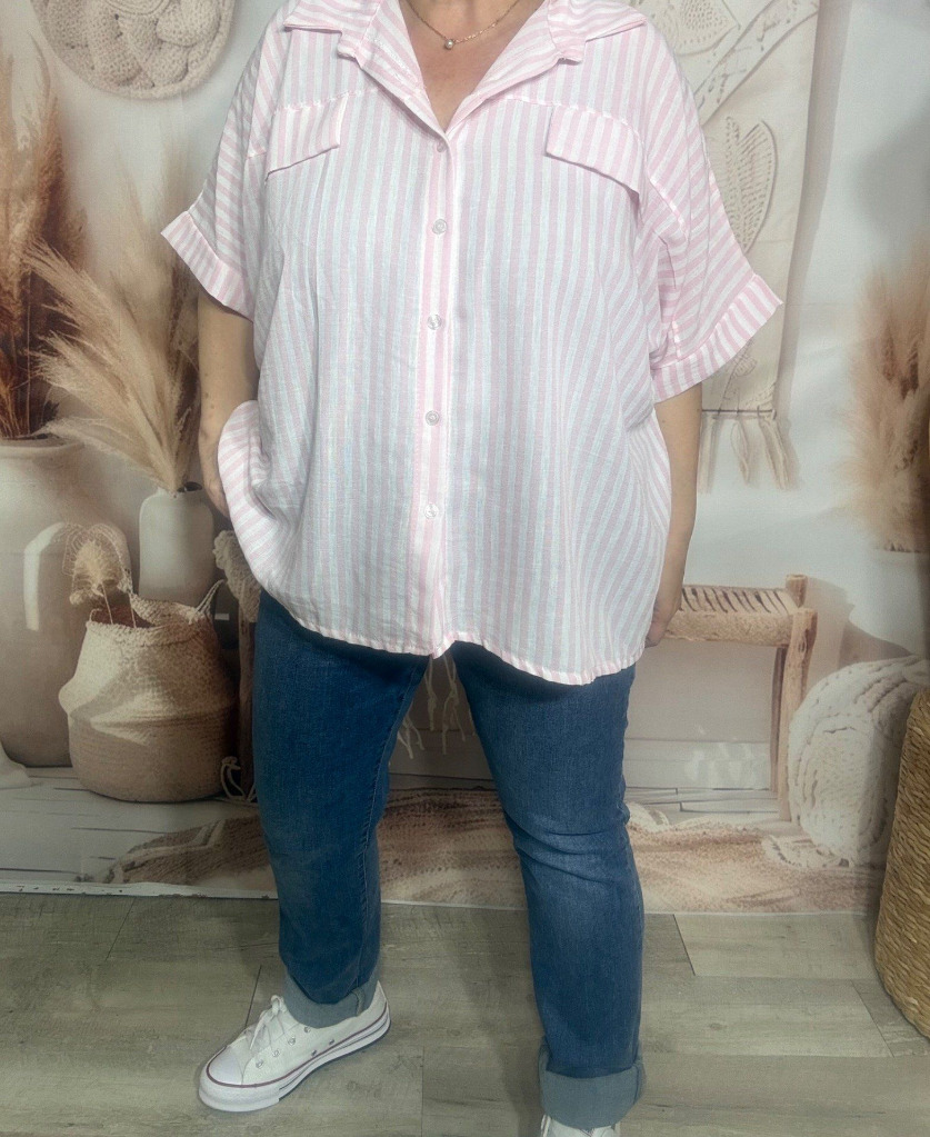 Chemise oversize rayée rose bébé & blanc effet gaufré et aspect Lin du 40 au 52/54