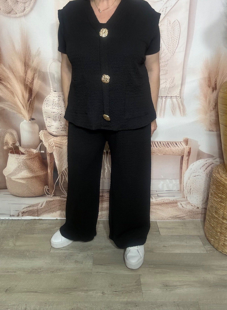 Ensemble gaufré noir pantalon large + Top court sans manches + broches dorées du 40 au 50/52