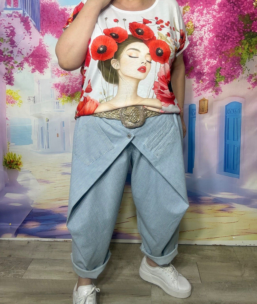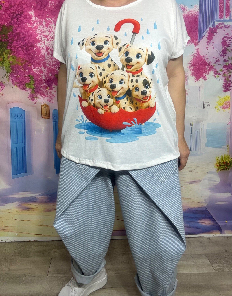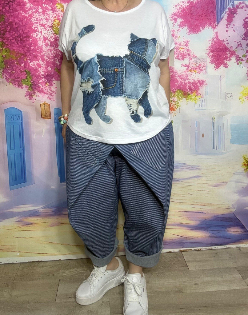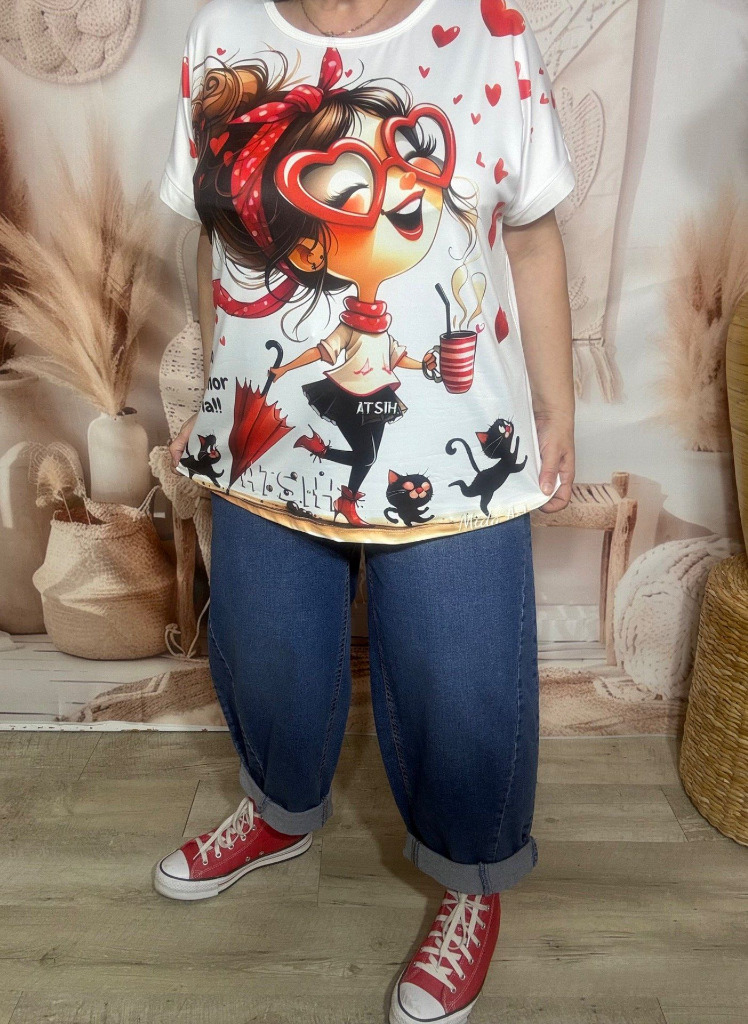 Tee-shirt ample blanc manches courtes La Fillette et son chat du 40 au 50/52