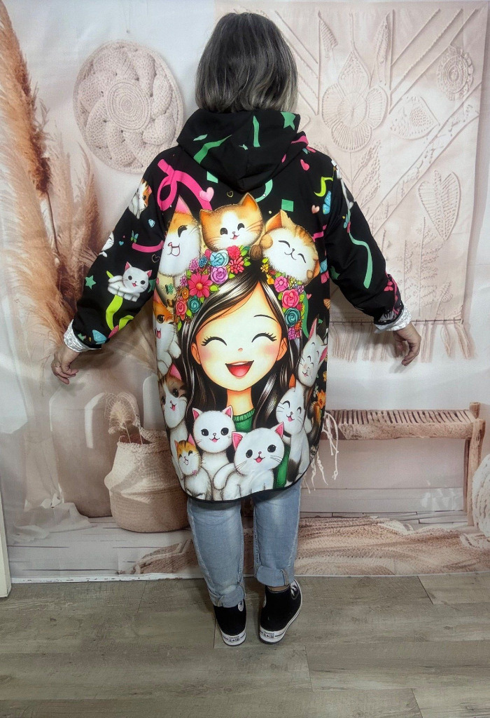 Coupe-vent à capuche déperlant La Fillette et ses chats du 38 au 50/52 et même + si porté ouvert