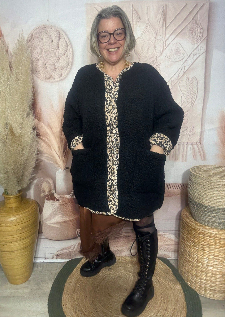 Gilet-veste moumoute Sherpa noire et suédine Léopard du 40 au 52/54 et même +