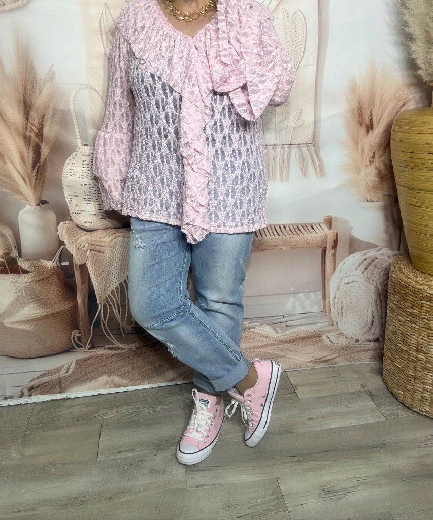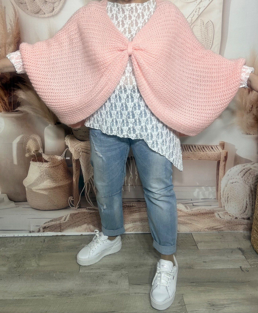 pull asymétrique long rose bonbon col V et dentelle assortie douceur +++ du 40 au 54/56