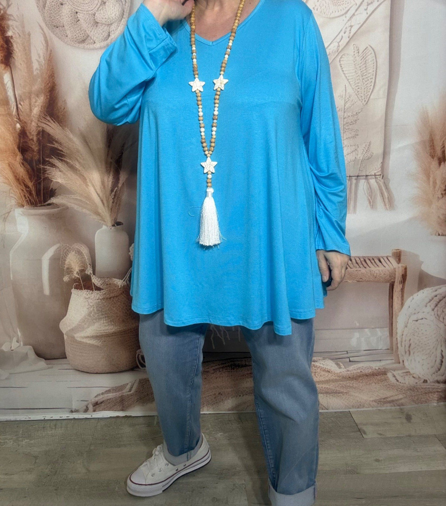 Top trapèze Bleu Cyan manches longues col V collection Les Basiques du Dressing du 40 au 54
