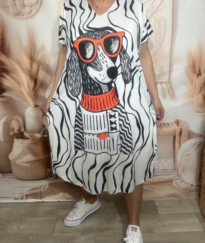 Robe mi-longue ample lycra blanche zébrée Le Chien Lévrier à lunettes du 42 au 54