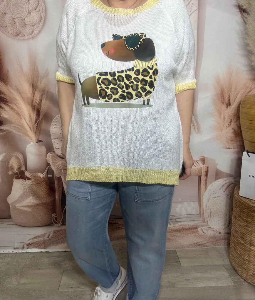 Pull fin SANS LAINE blanc & jaune clair L'Adorable Teckel Léopard du 40 au 50/52