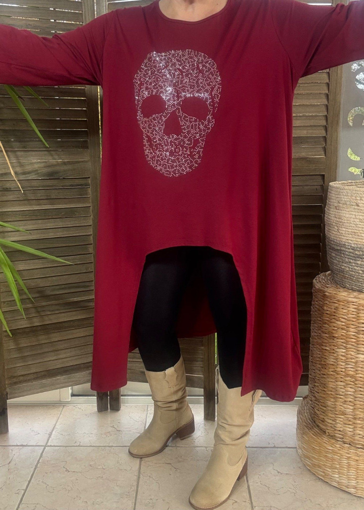 Maxi-tunique asymétrique Bordeaux Mexican Skulls Calavera Strass du 40 au 52