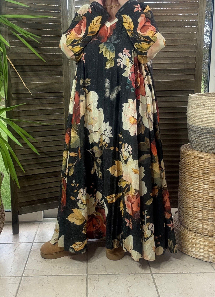 Robe longue trapèze plissée Les Fleurs d'Automnes Lurex pailleté doré du 42 au 58/60