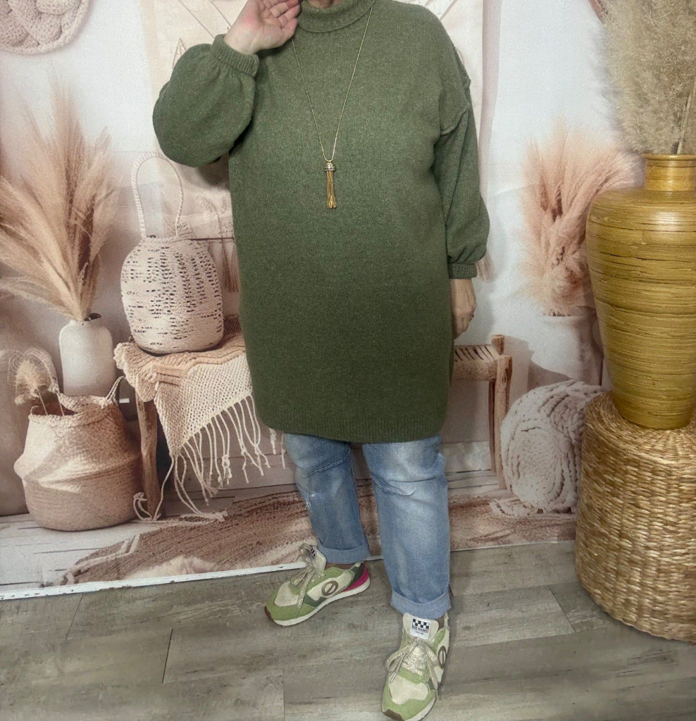 Robe-pull Kaki ou maxi-pull col montant cheminée douceur ++++ du 40 au 50/52