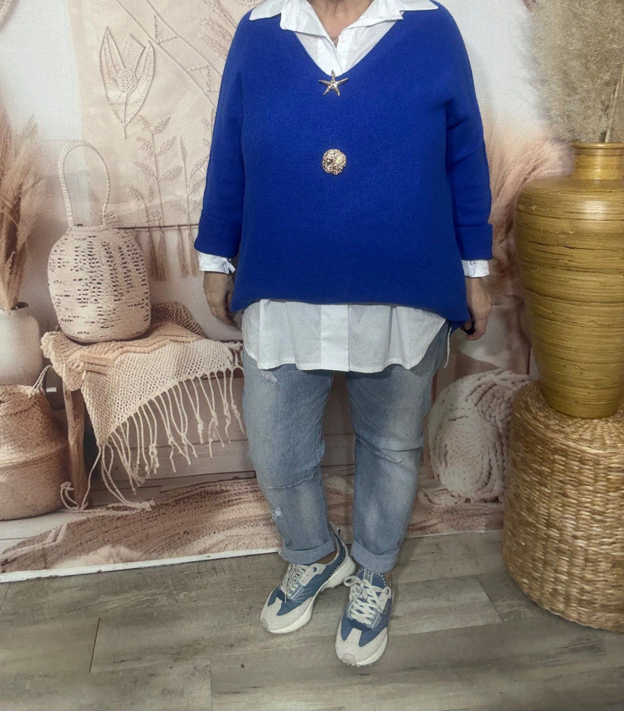 pull ample SANS LAINE Bleu royal col V + 2 broches dorées du 40 au 52