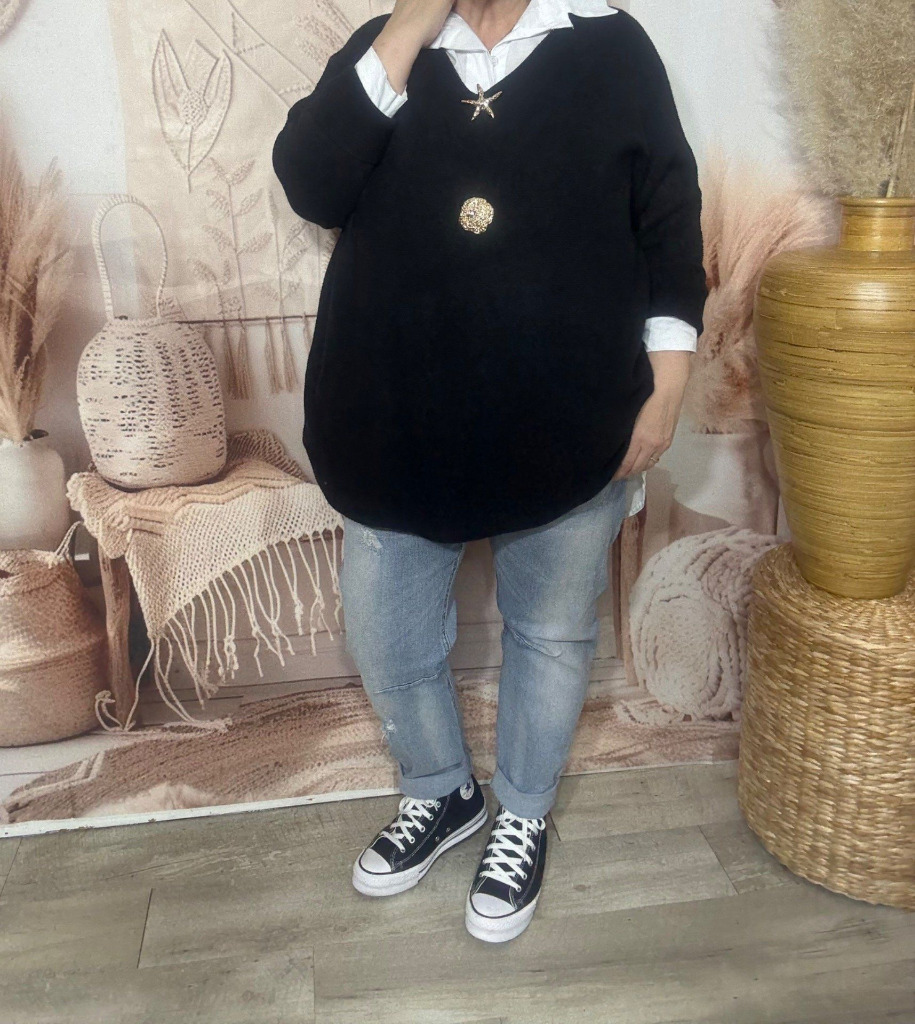 pull ample SANS LAINE noir col V + 2 broches dorées du 40 au 52