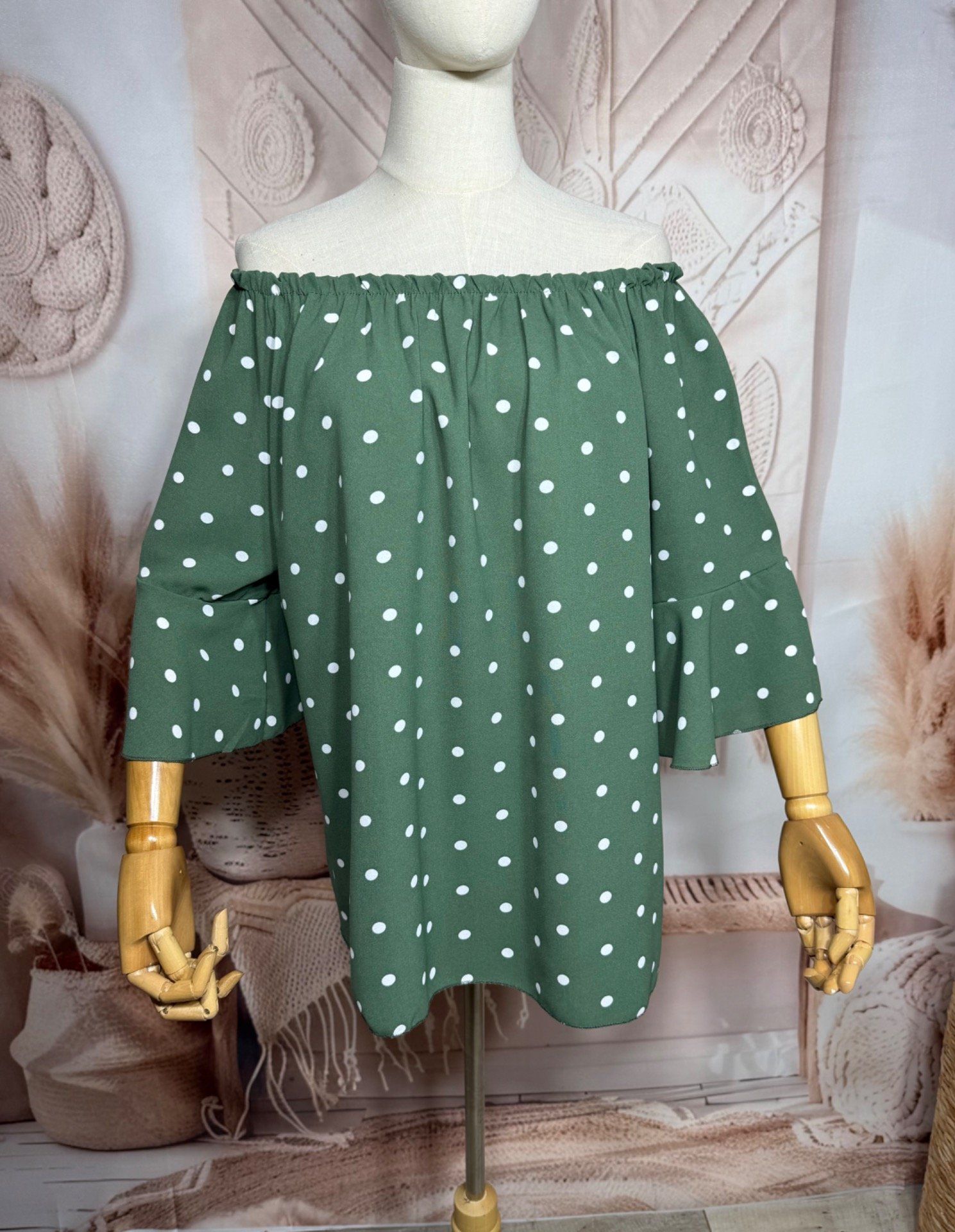 Blouse Bohème chic Kaki pois blancs manches volantées épaules dénudées du 38 au 50/52