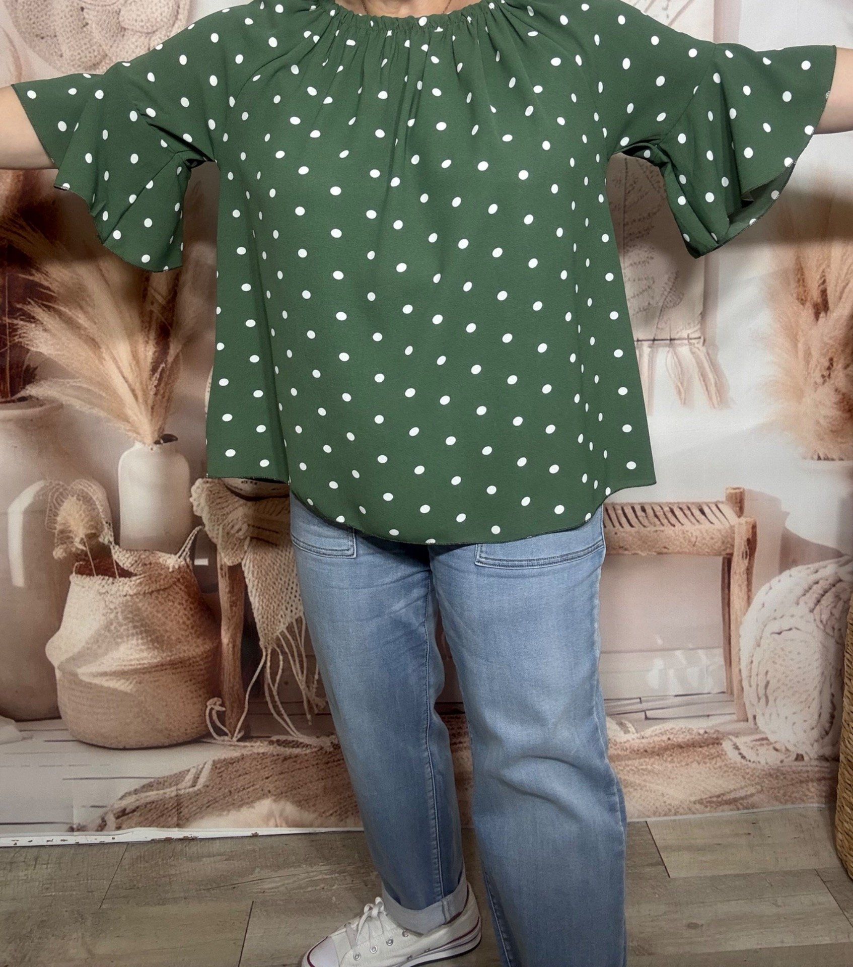 Blouse Bohème chic Kaki pois blancs manches volantées épaules dénudées