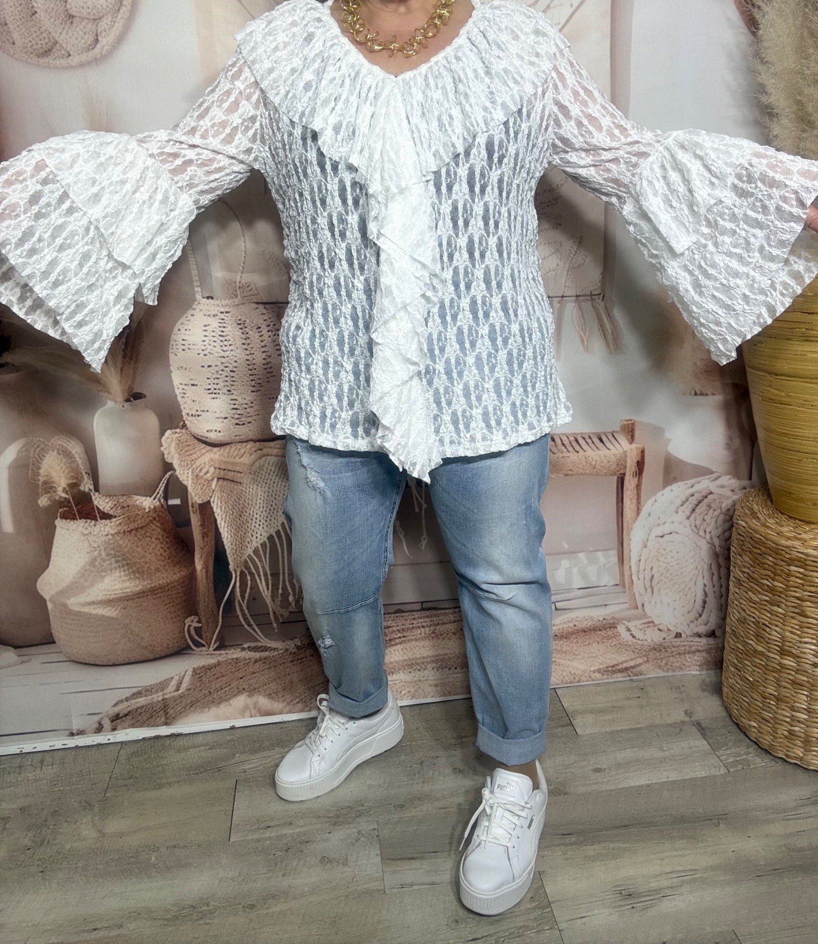 Blouse trapèze col jabot dentelle blanche manches pagodes confort +++ du 40 au 50/52