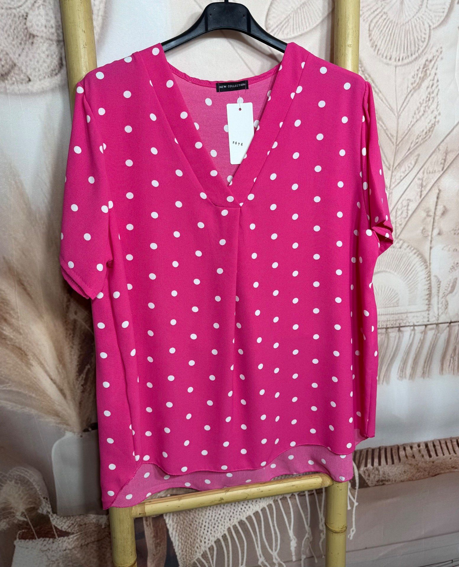 Blouse trapèze Fuschia pois blancs manches courtes col V du 38 au 48