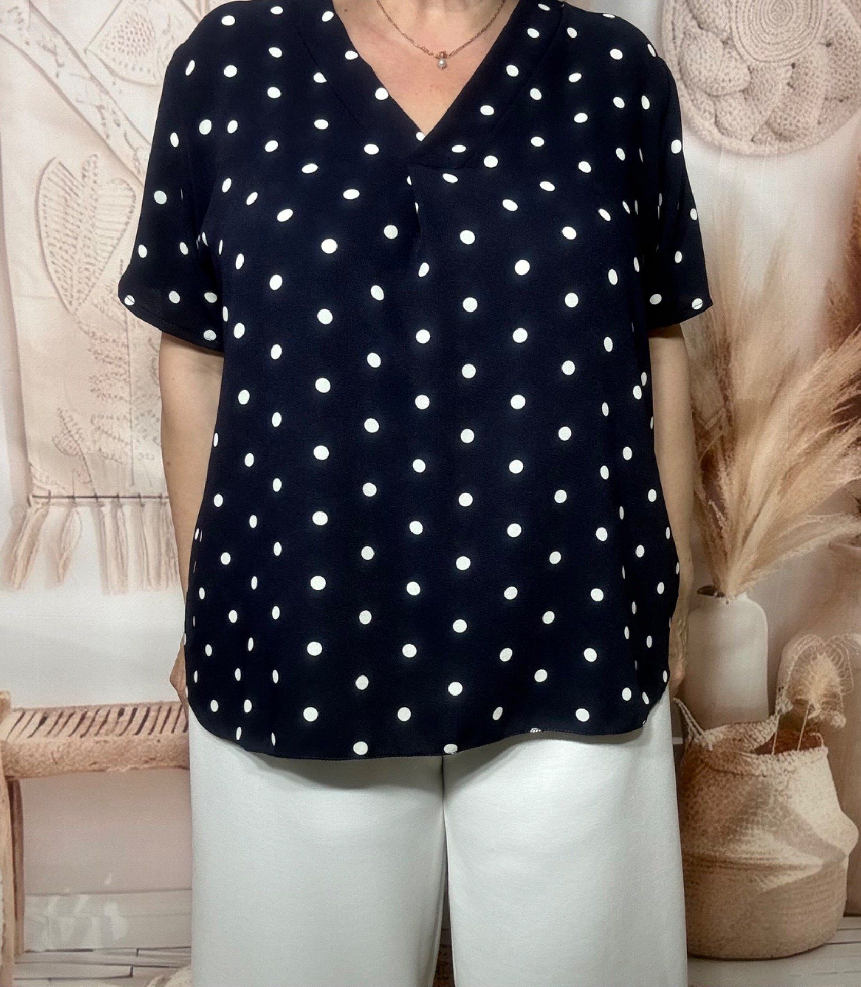 Blouse trapèze marine pois blancs manches courtes col V