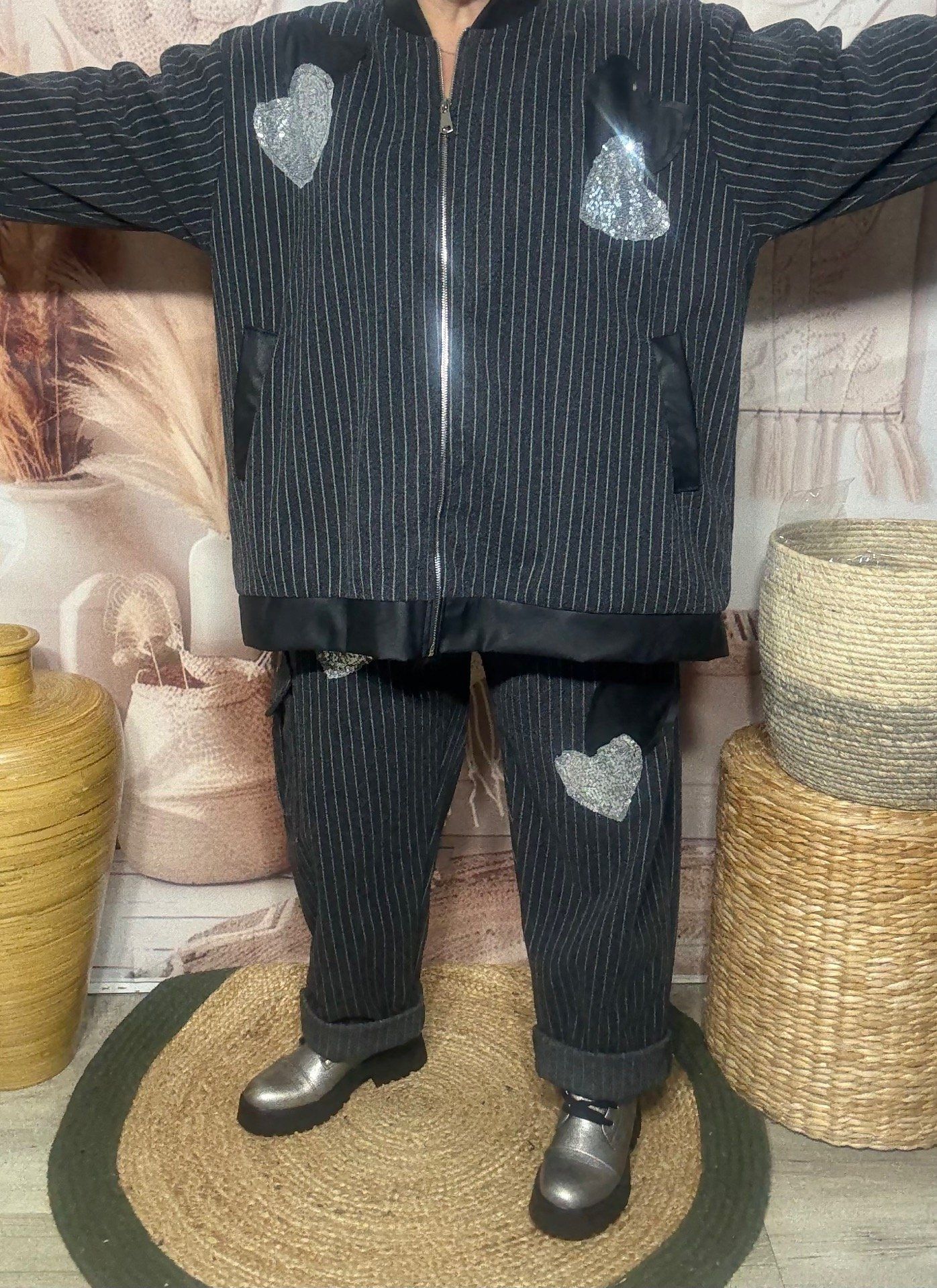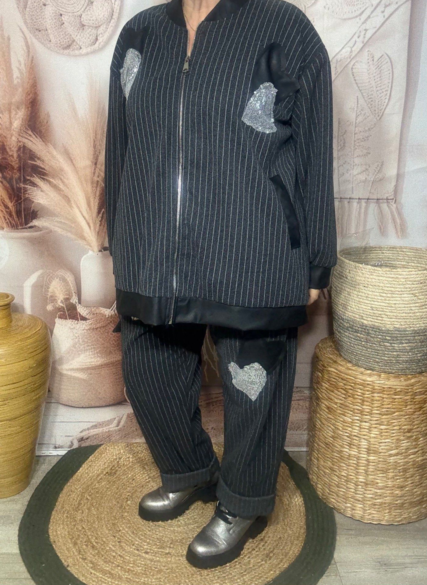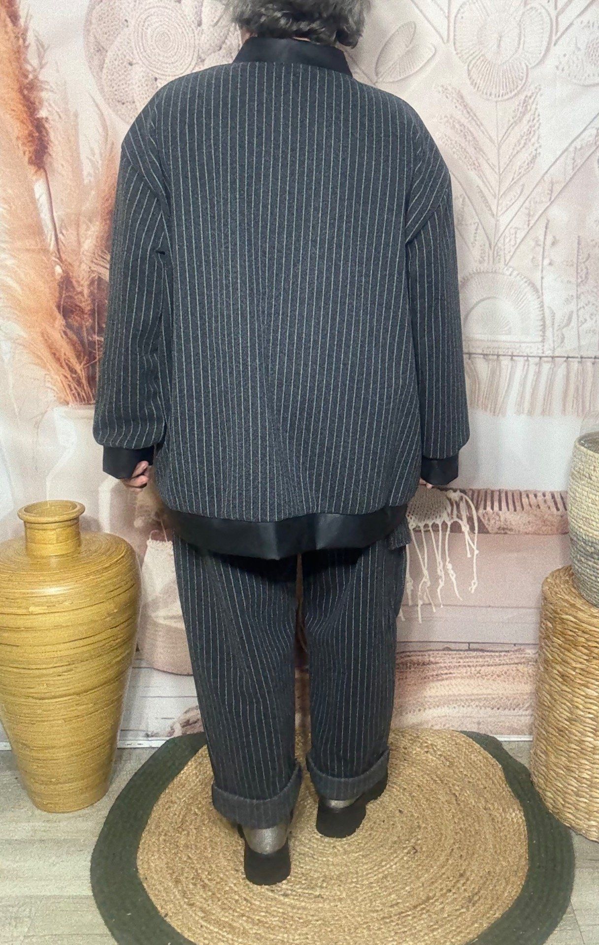 Blouson bombers ample gris fines rayures patchs strass du 42 au 52 et même +