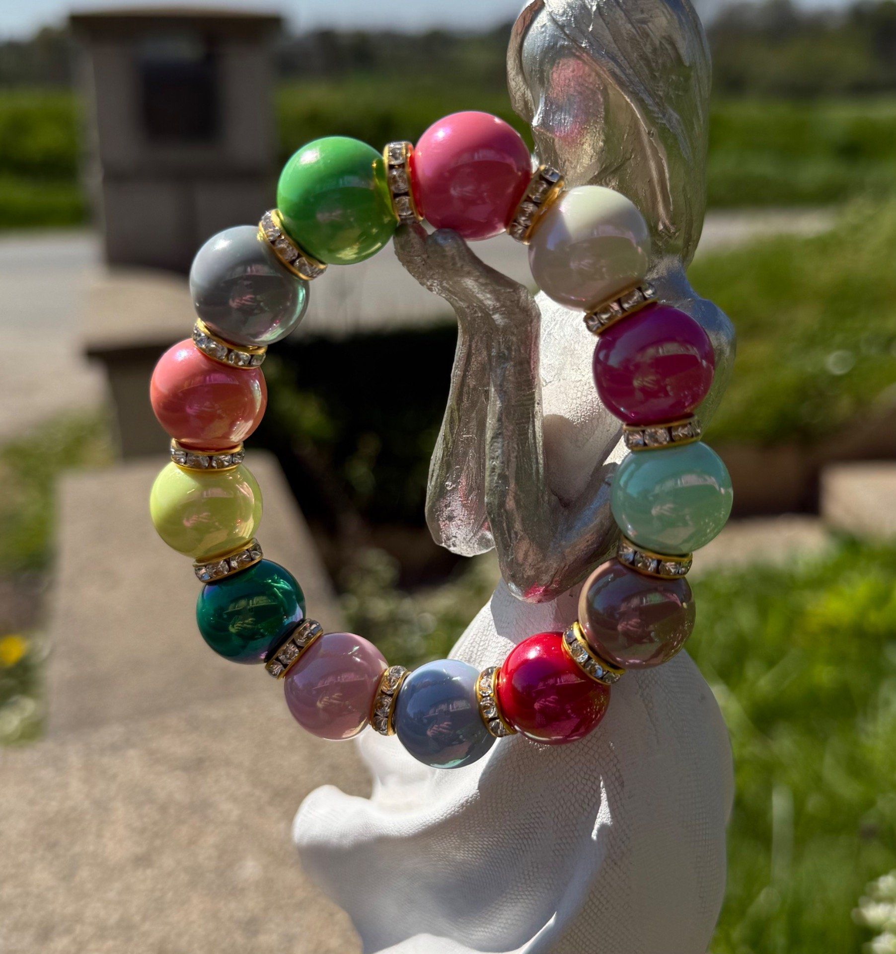 Bracelet ARTISANAL extensible N°1 perles multicolores apprêts strass dorés TOUTES TAILLES
