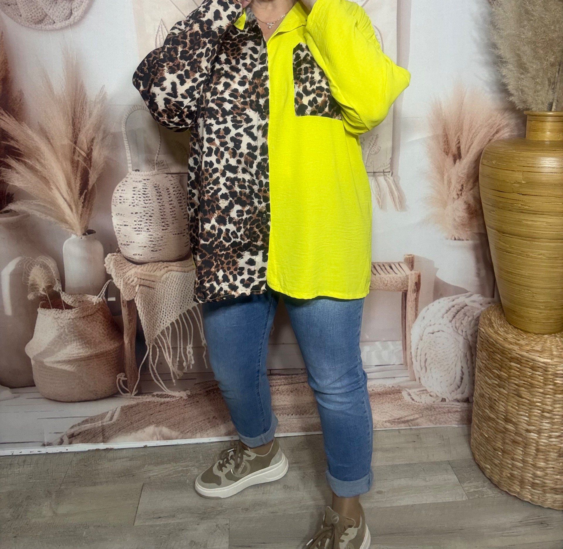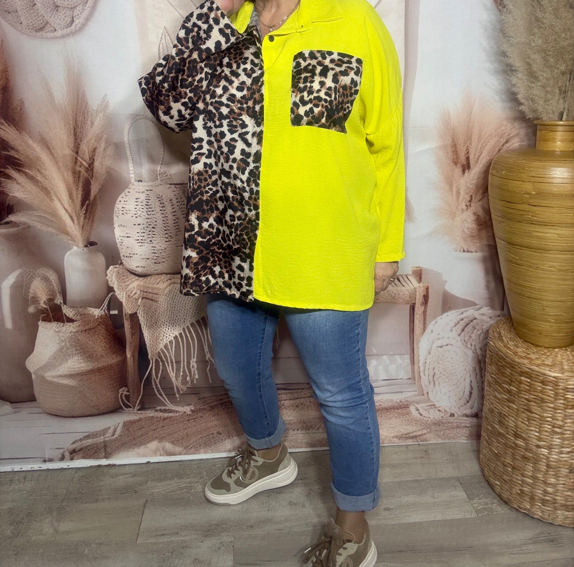 Chemise ample bicolore jaune citron Léopard camel caramel du 40 au 50/52