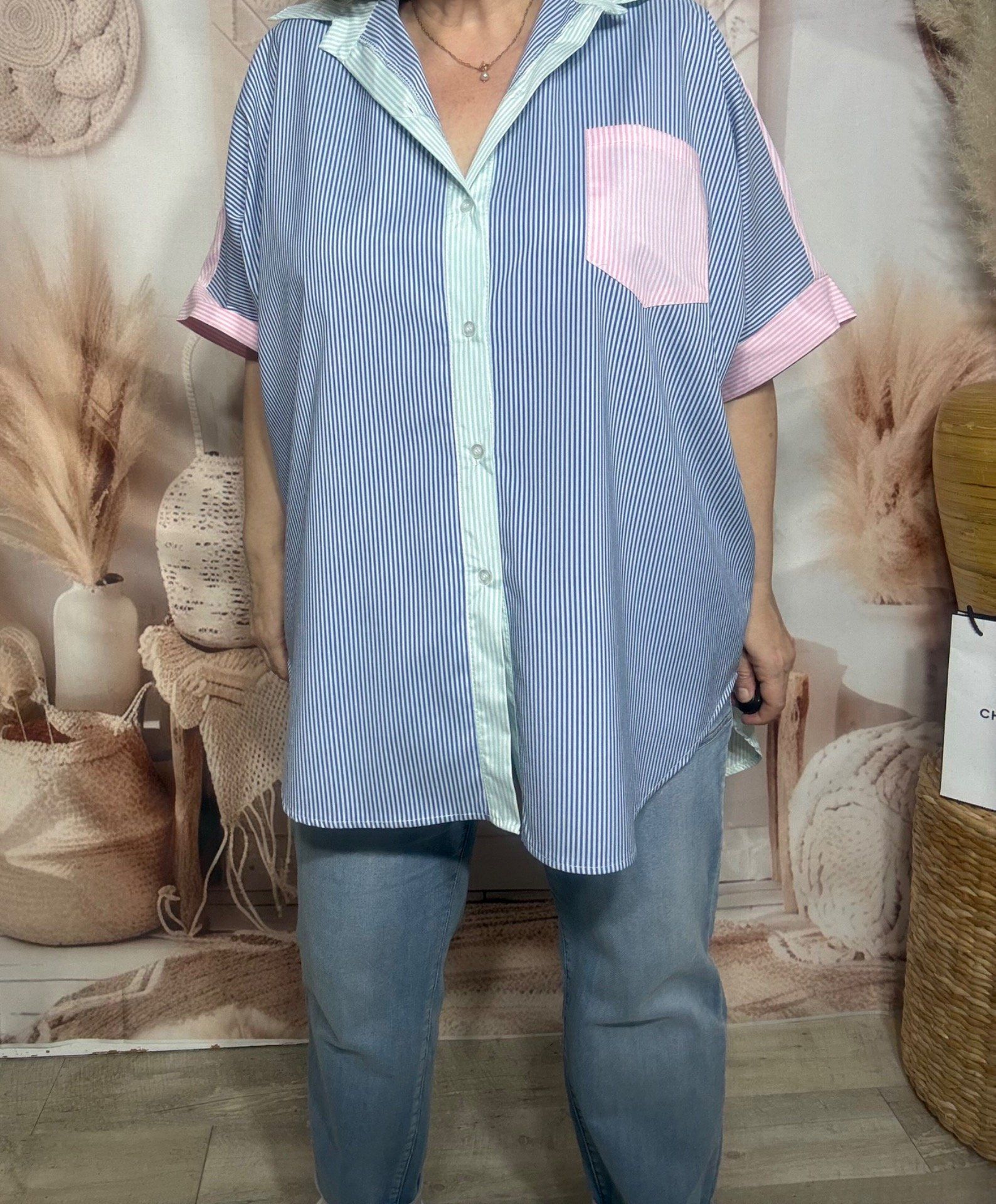 Chemise oversize asymétrique rayée marine + vert pastel + rose bonbon