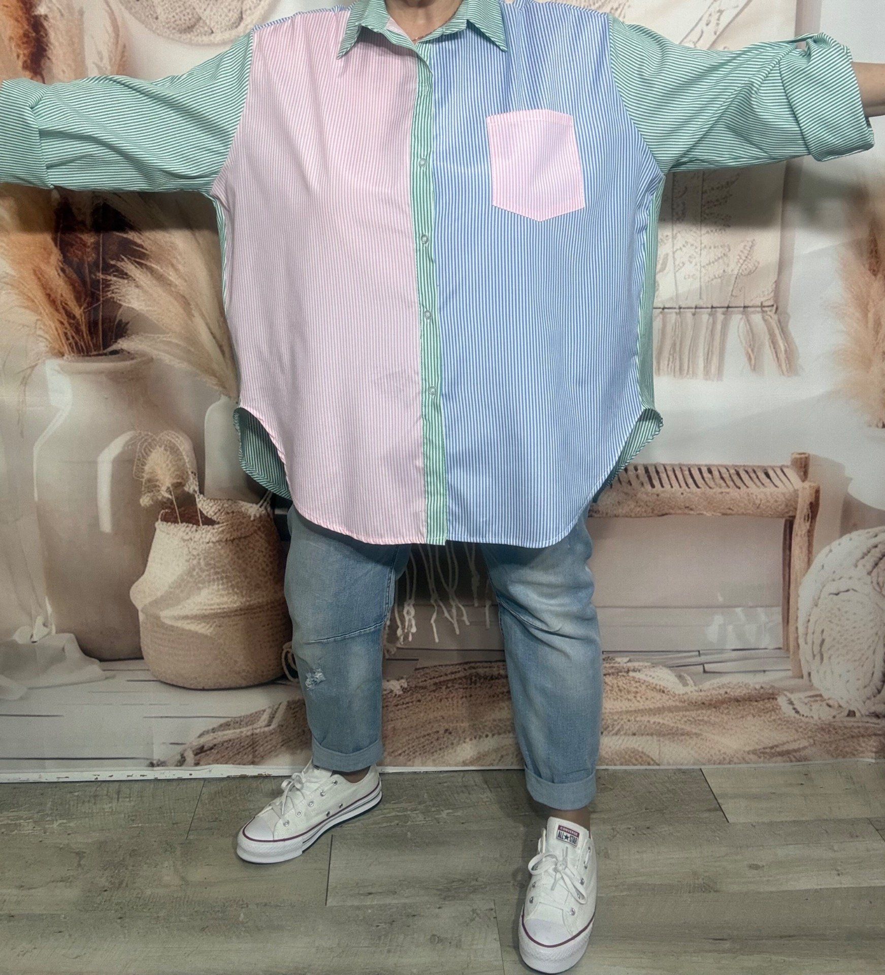 Chemise oversize asymétrique rayée rose bonbon et bleu sur fond vert Gucci du 42 au 52/54