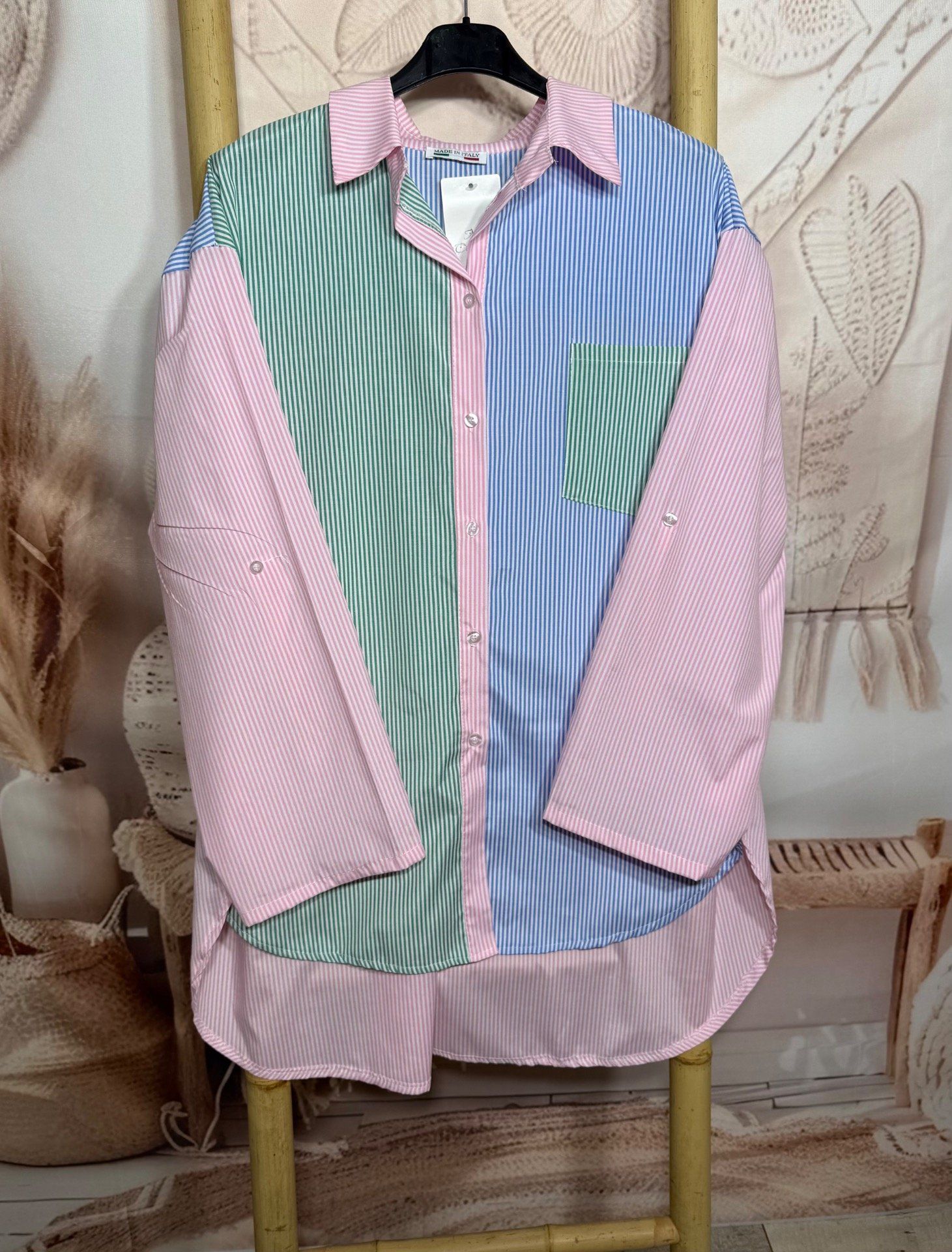 Chemise oversize asymétrique rayée vert et bleu sur fond rose bonbon