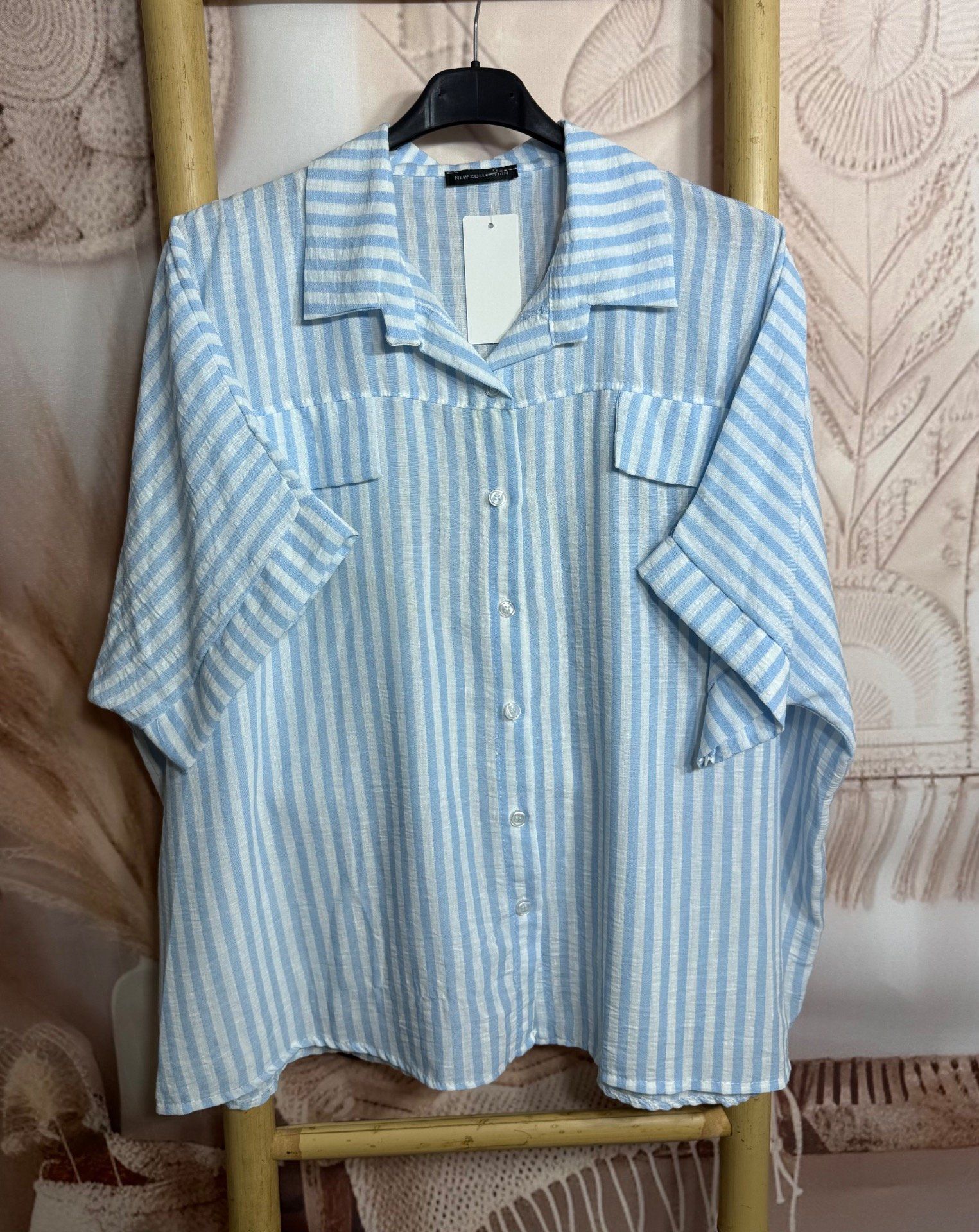 Chemise oversize rayée bleu ciel & blanc effet gaufré et aspect Lin du 40 au 52/54