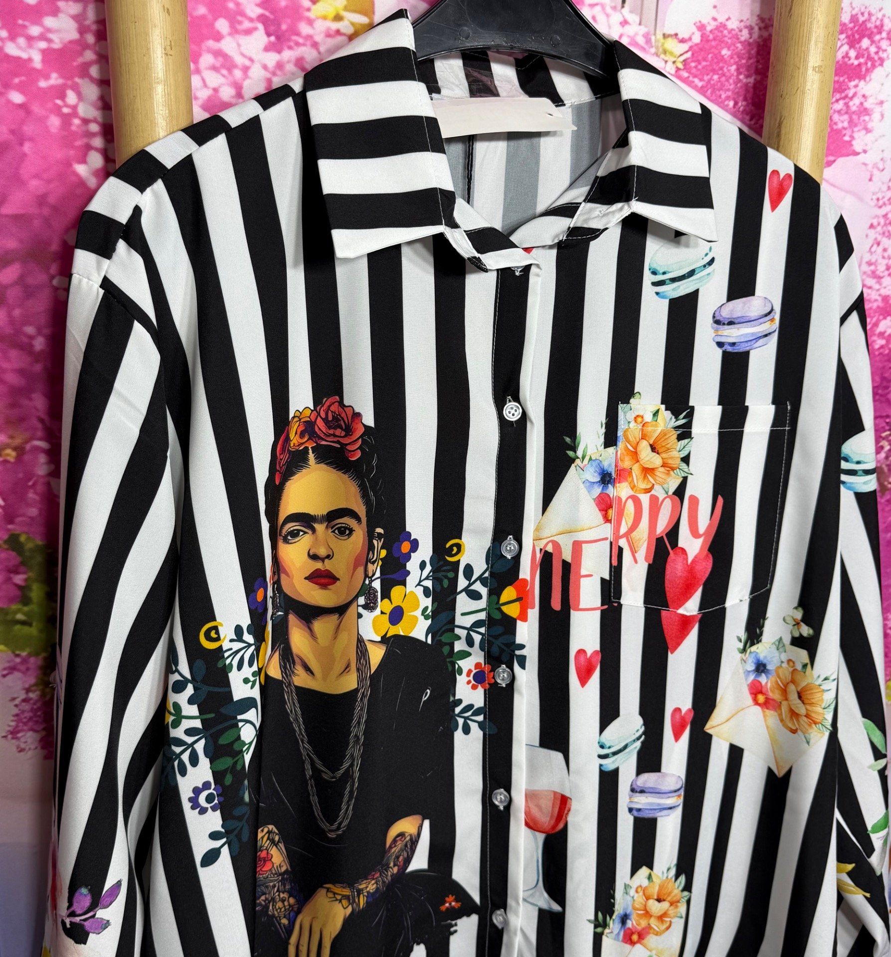 superbe imprimé Frida Kahlo sur fond rayé blanc et noir :-)