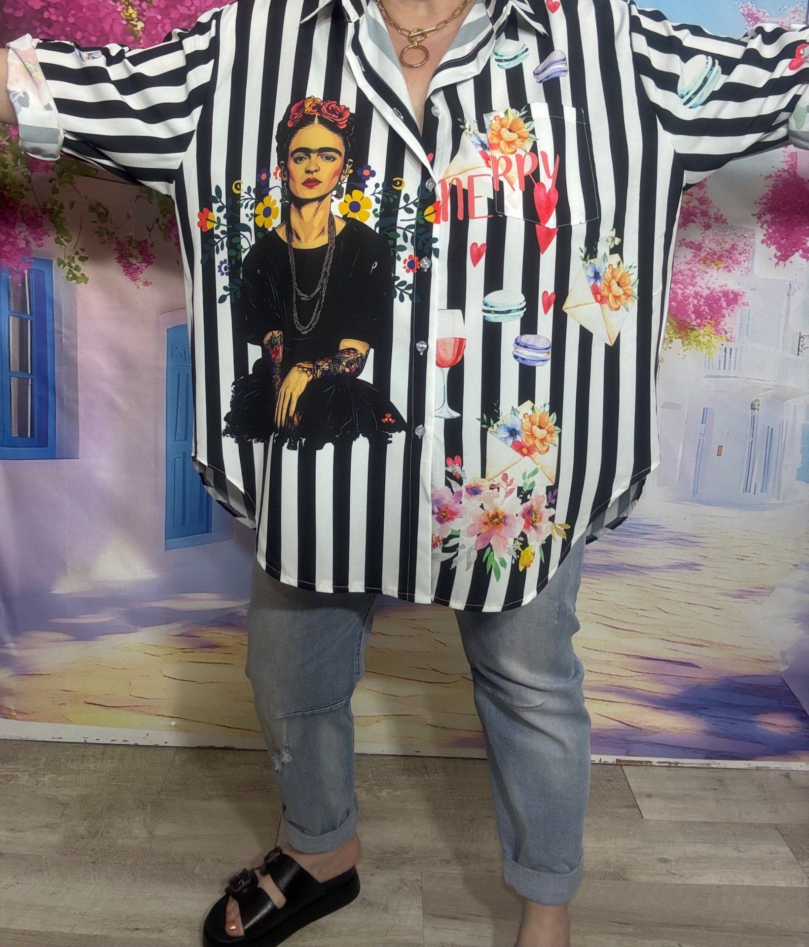 Chemise rayée noire et blanche manches réglables Tattoo Frida Kahlo & Fleurs
