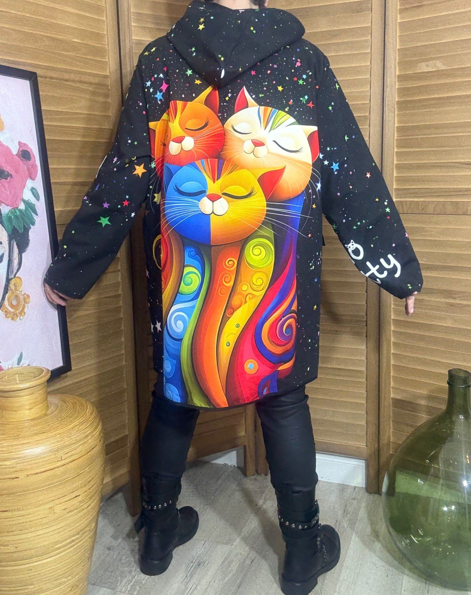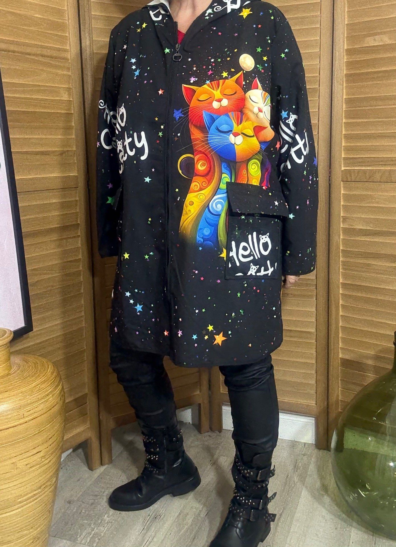 Coupe-vent à capuche déperlant noir Les Adorables Chats du 38 au 50/52 et même + si porté ouvert