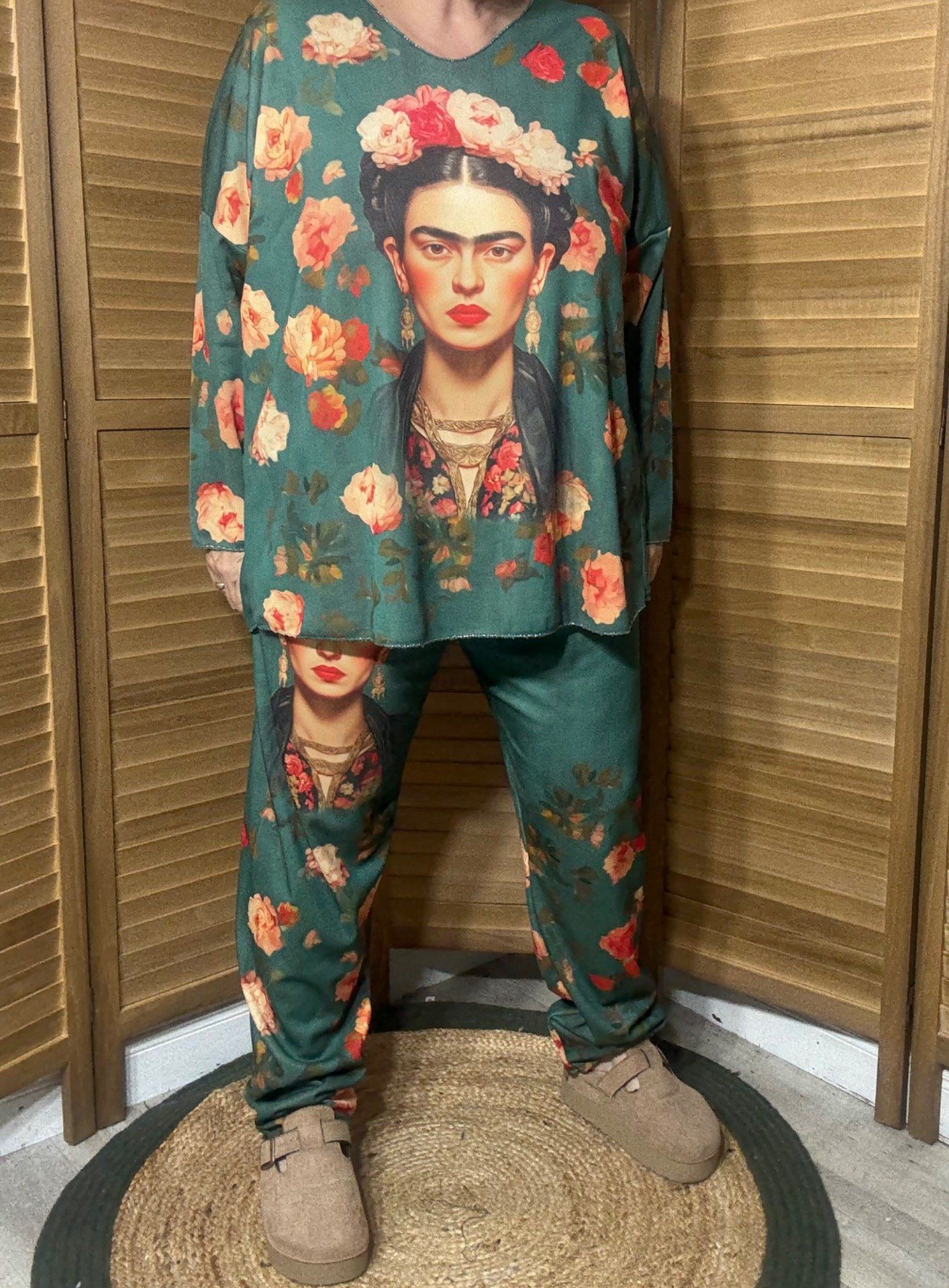 Ensemble Cocooning ou pyjama vert bouteille Frida Kahlo polaire confort +++ du 40 au 52/54