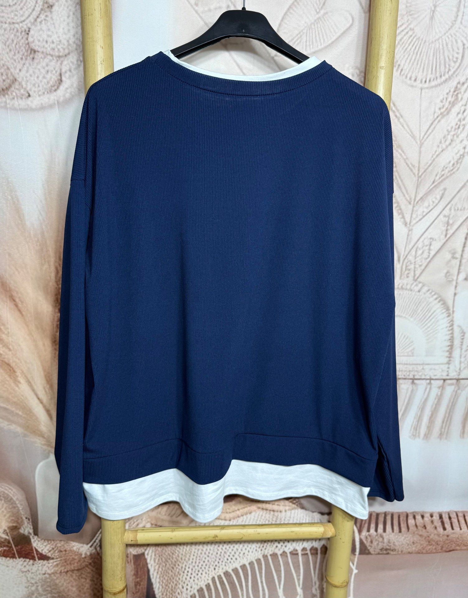 on a un effet trompe-l-oeil au niveau du col et en bas du sweat avec cette partie en coton blanc laissant penser à un teeshirt blanc dessous :-) Mais c'est un effet "teeshirt", tout est accroché en semble :-)