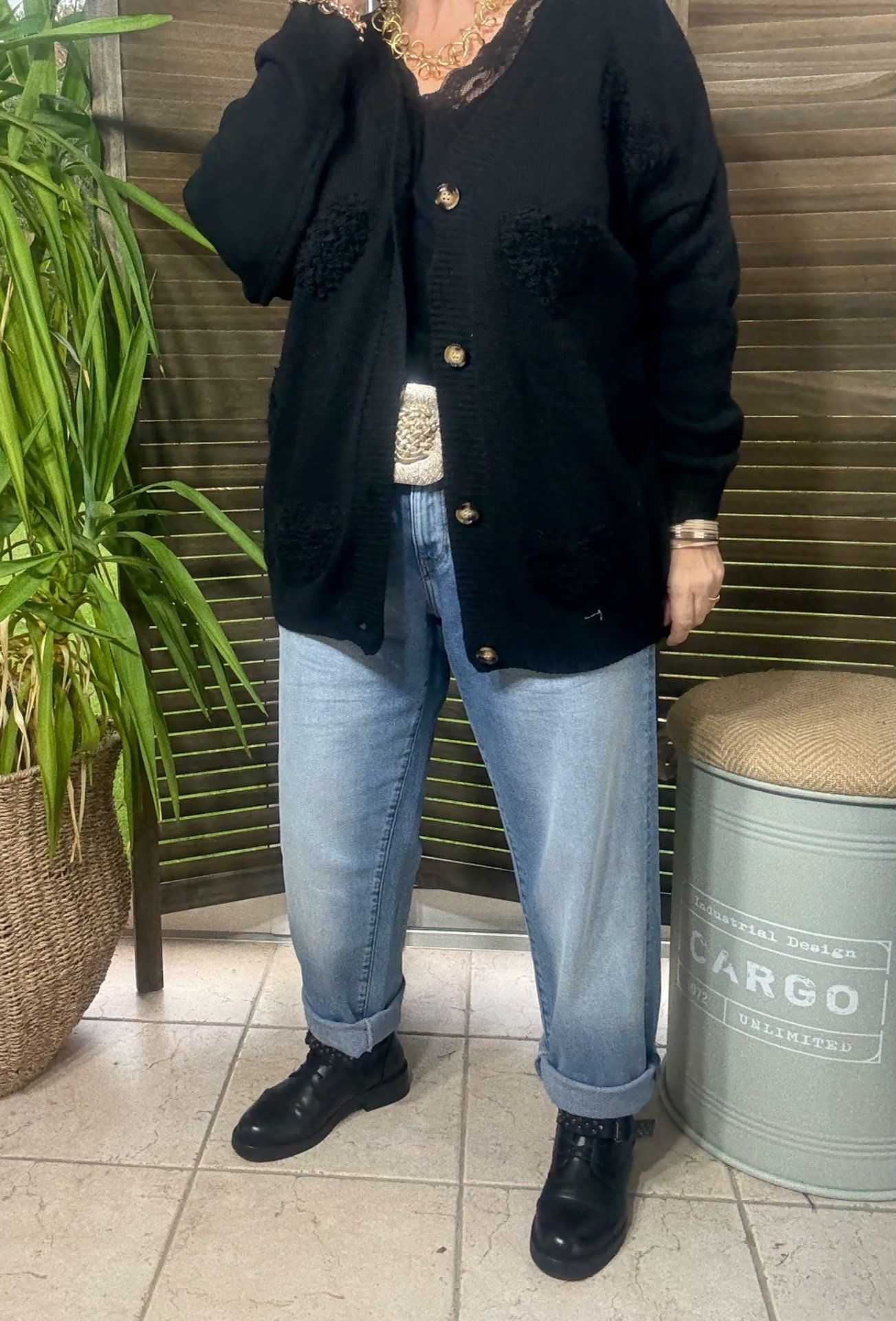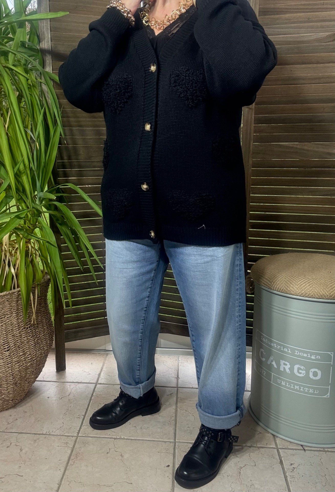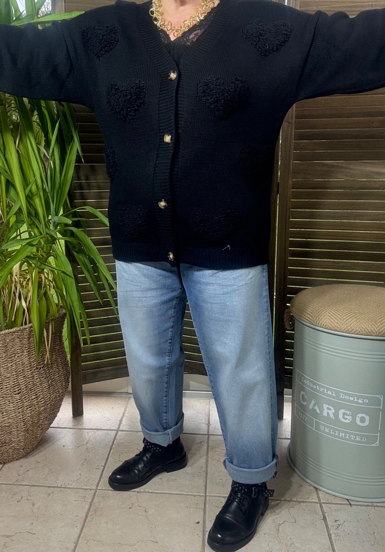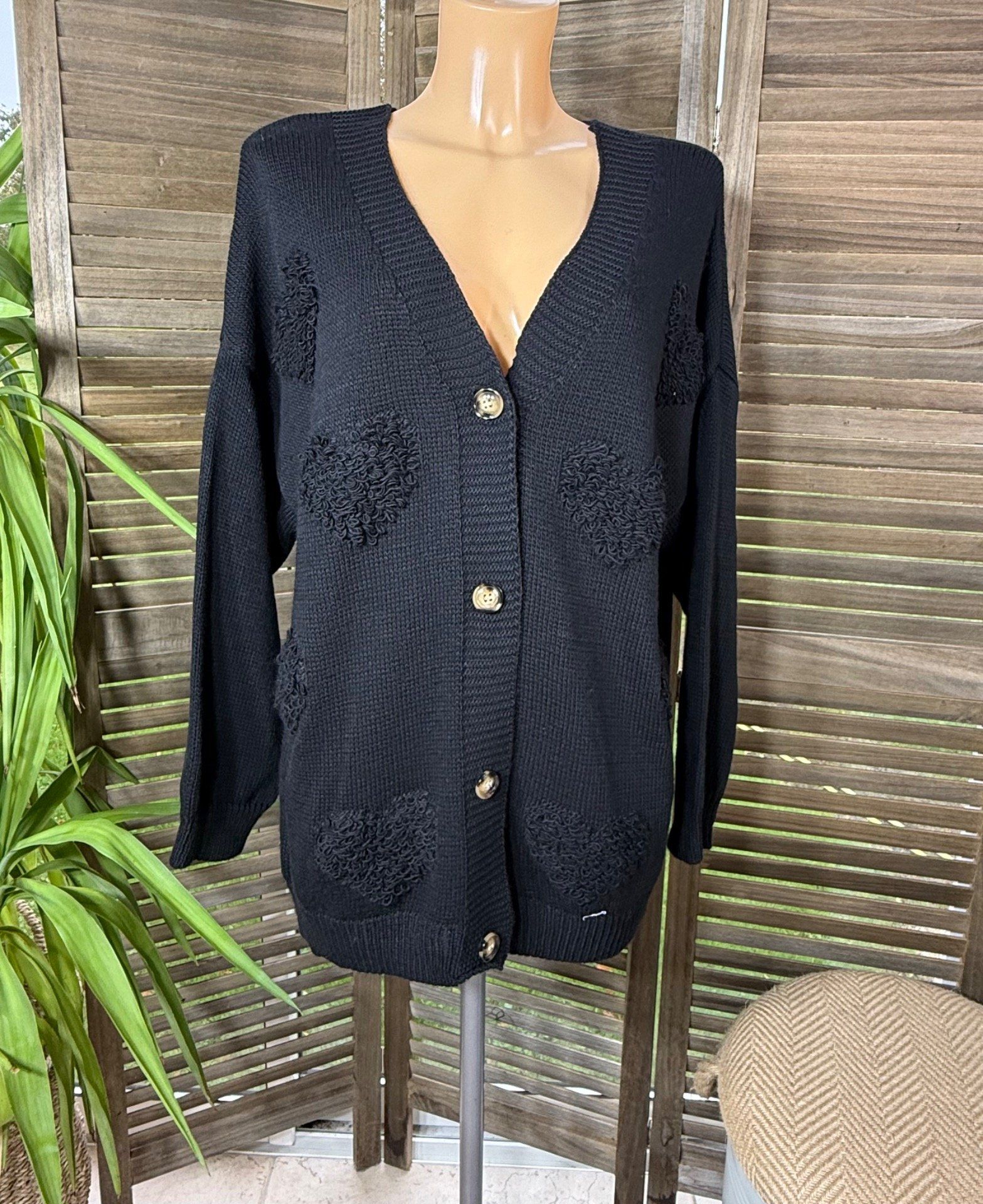 Gilet ample sans laine noir Coeurs bouclette en relief du 38 au 50 et même +
