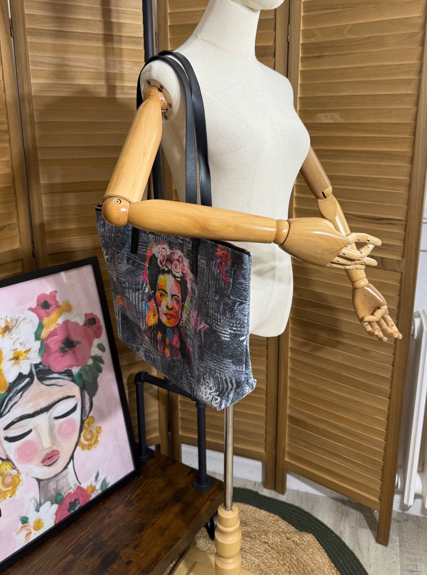 Grand sac besace + pochette suédine effet jeans & simili-cuir Frida Kahlo qualité ++++