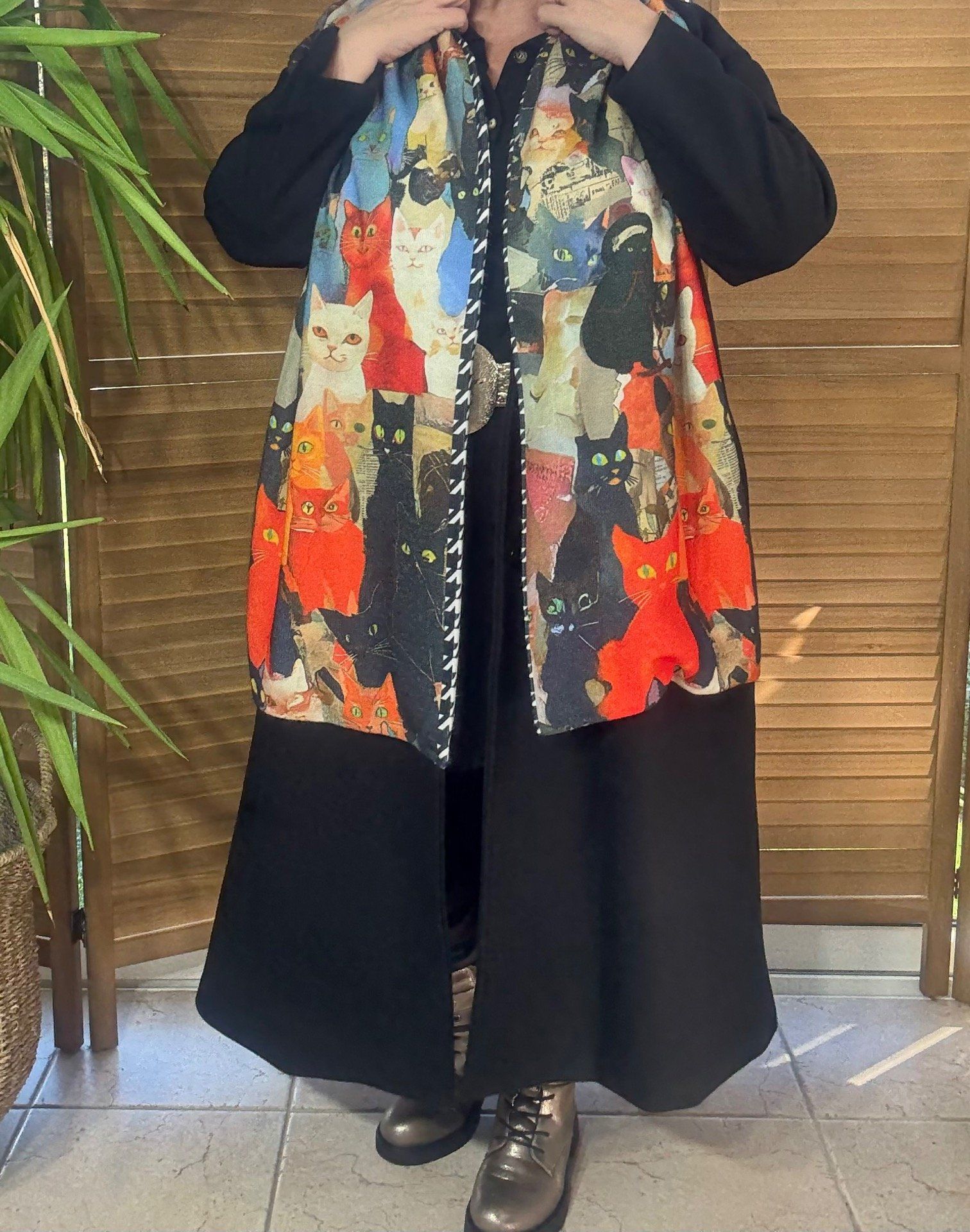 Les 2 faces de l'écharpe sont différentes : 1 côté avec les chats multicolores et l'autre face en pieds de coq noirs et blancs :-)