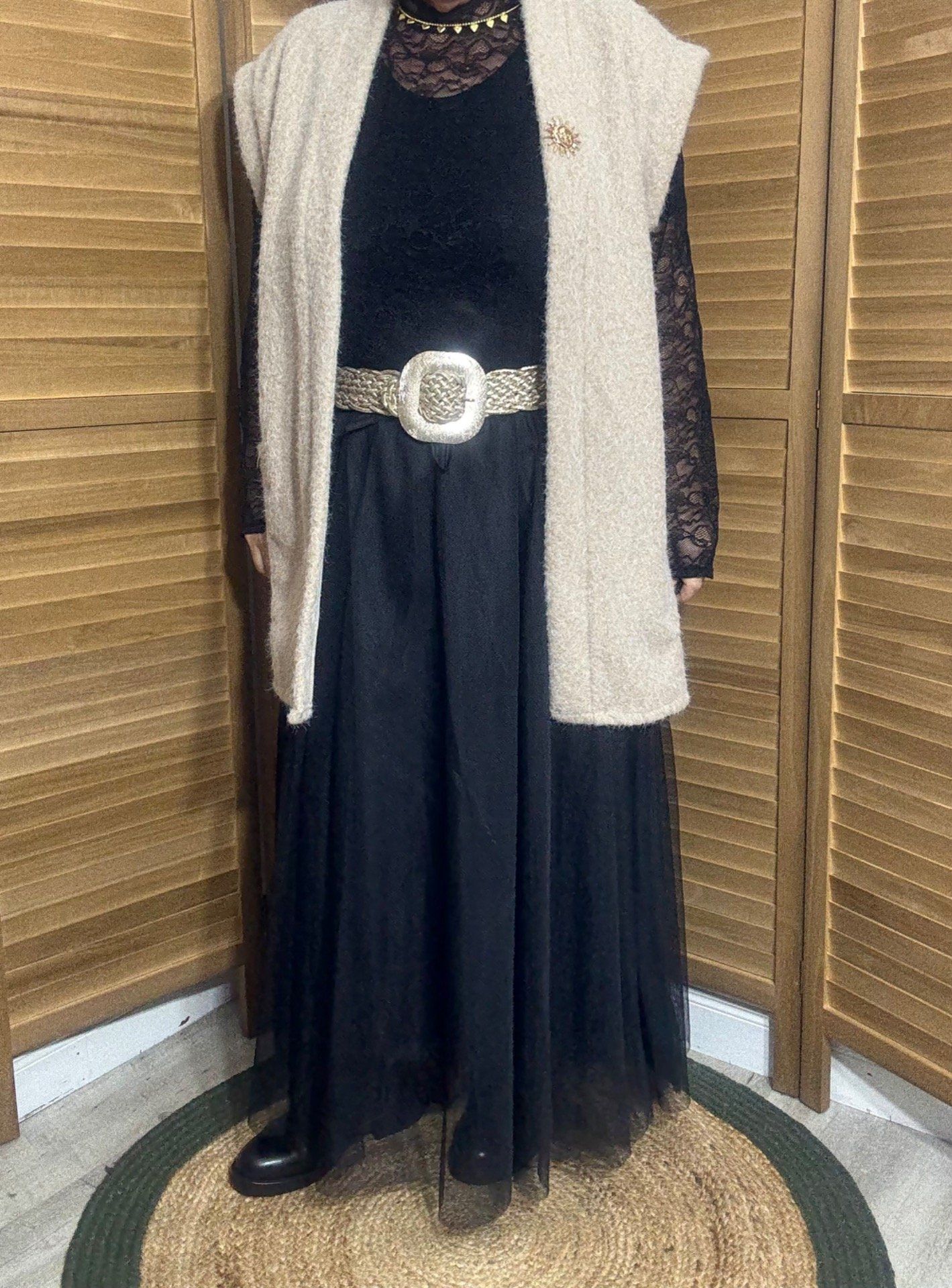 tulle noir (2 couches) + 1 doublure noire satinée non extensible (jusqu'au chevilles)