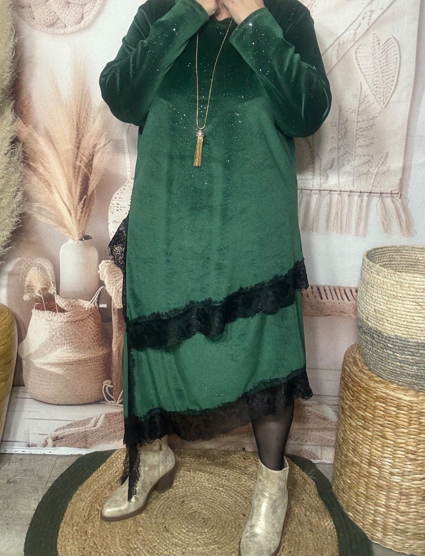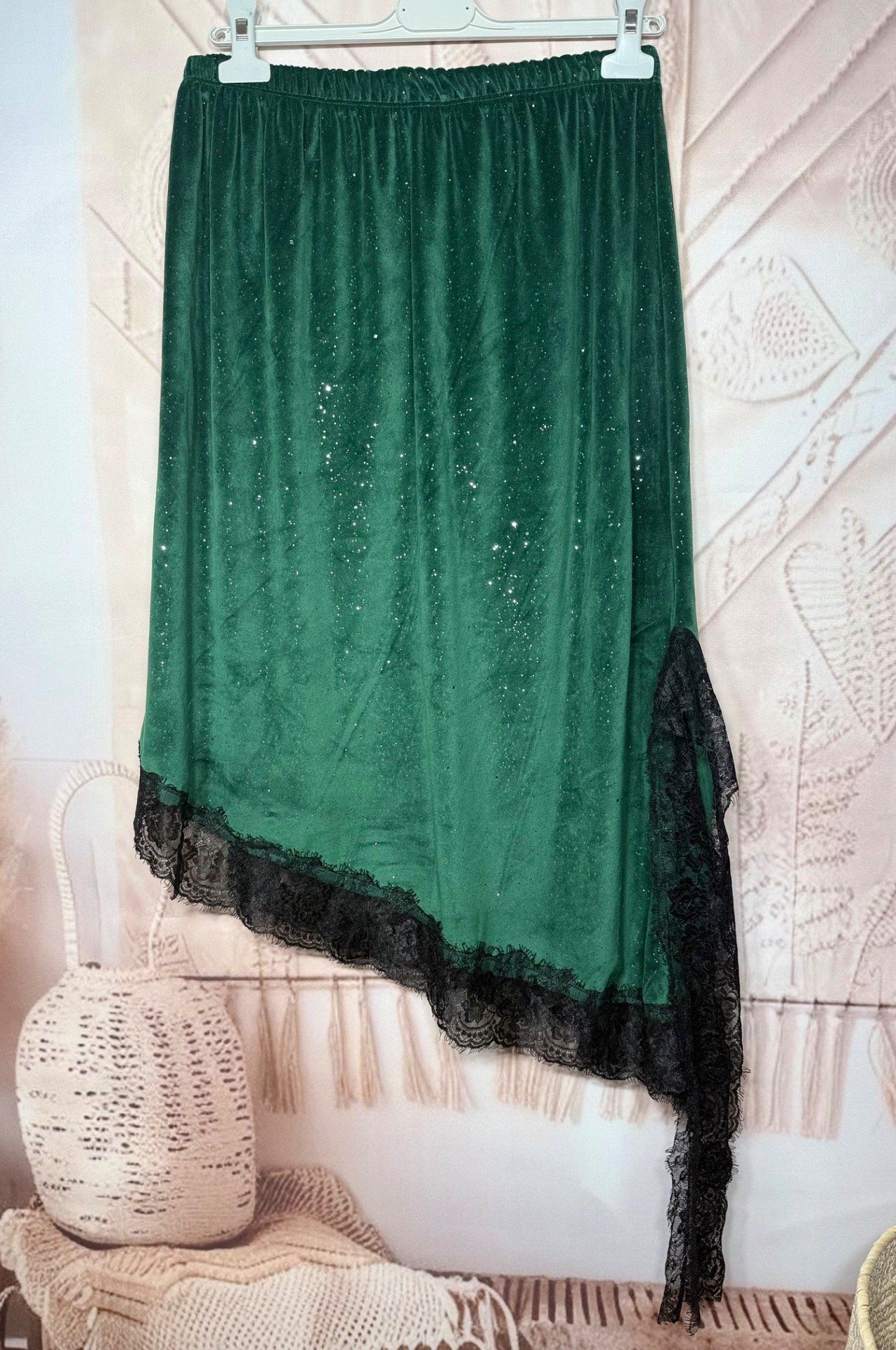 Jupe asymétrique velours vert Sapin strass paillettes argentées et dentelle noire