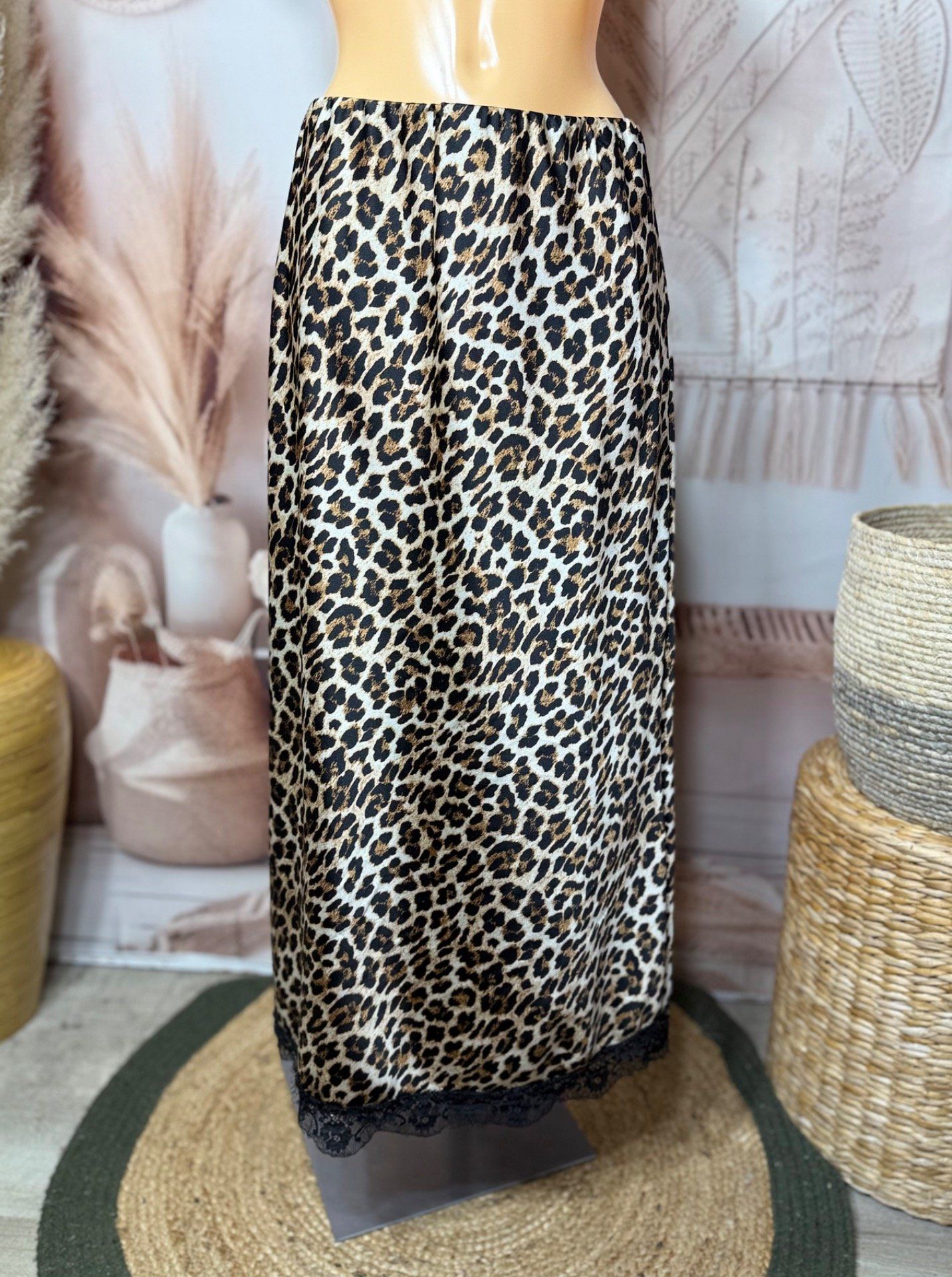 Jupe longue ample satinée Léopard camel et dentelle noire du 40 au 48