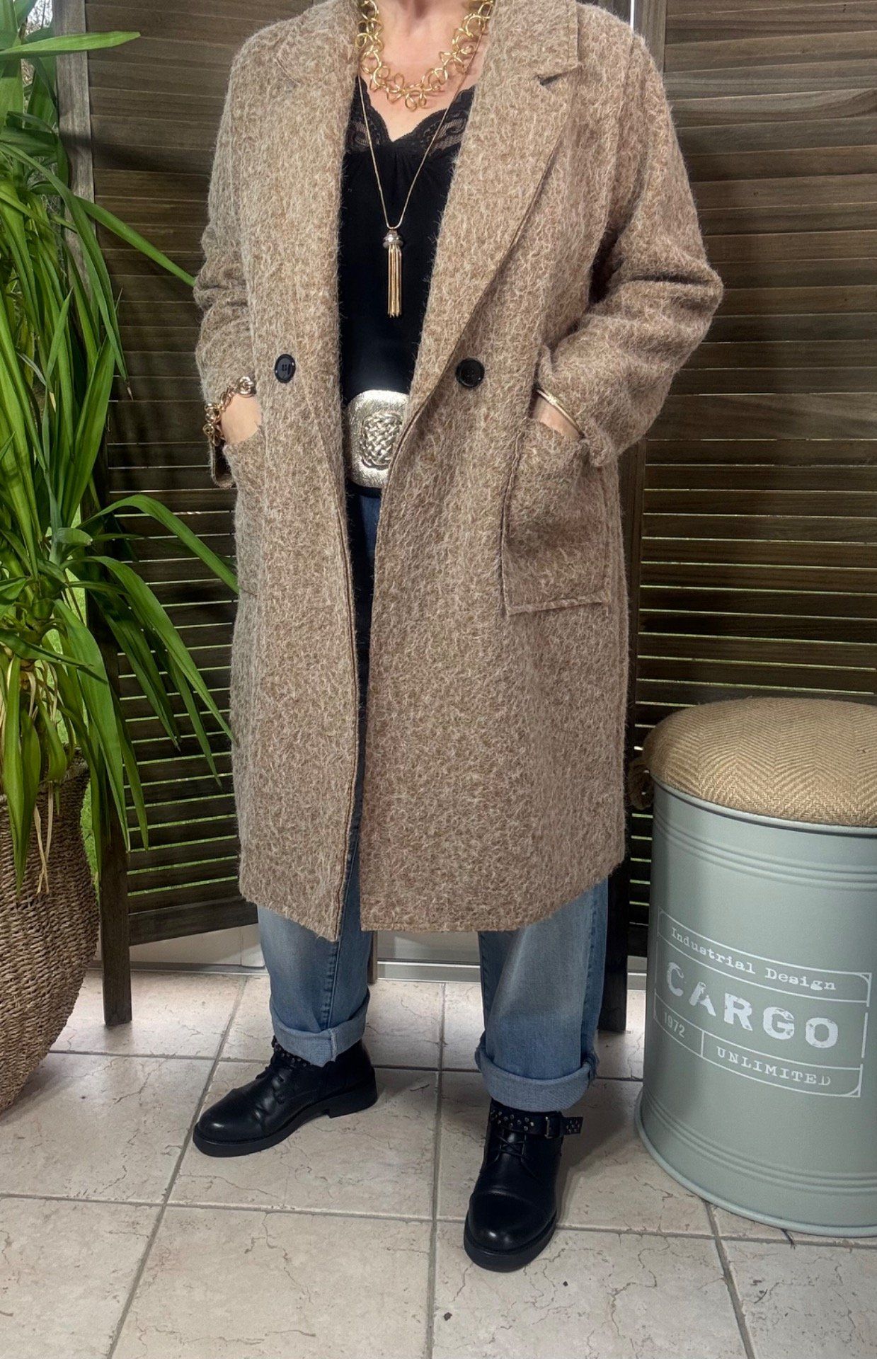 Manteau droit mi-long bouclette Camel chiné confort +++ du 36 au 46 et même +