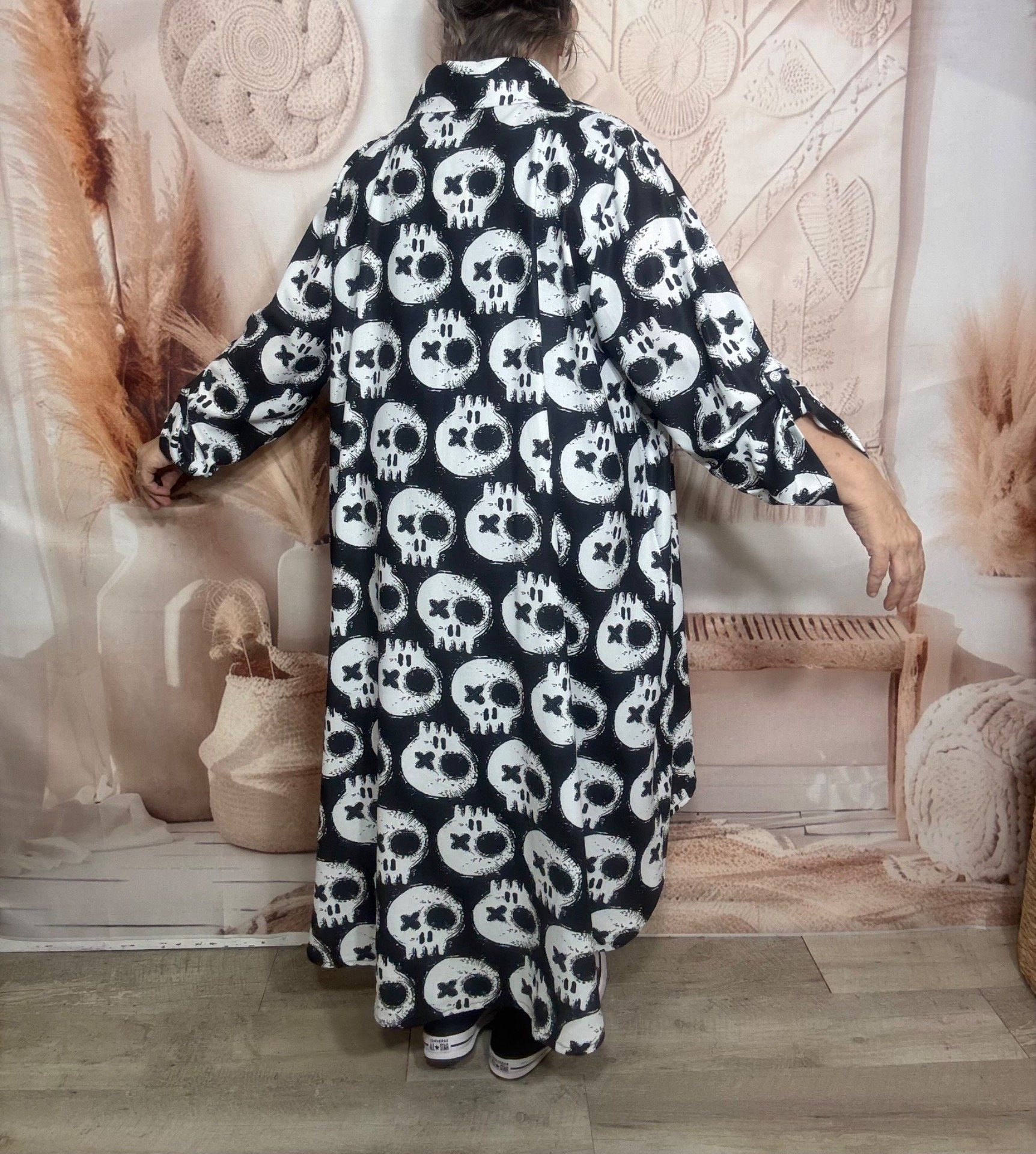 Maxi-chemise trapèze asymétrique noire Skulls Calaveras blanches