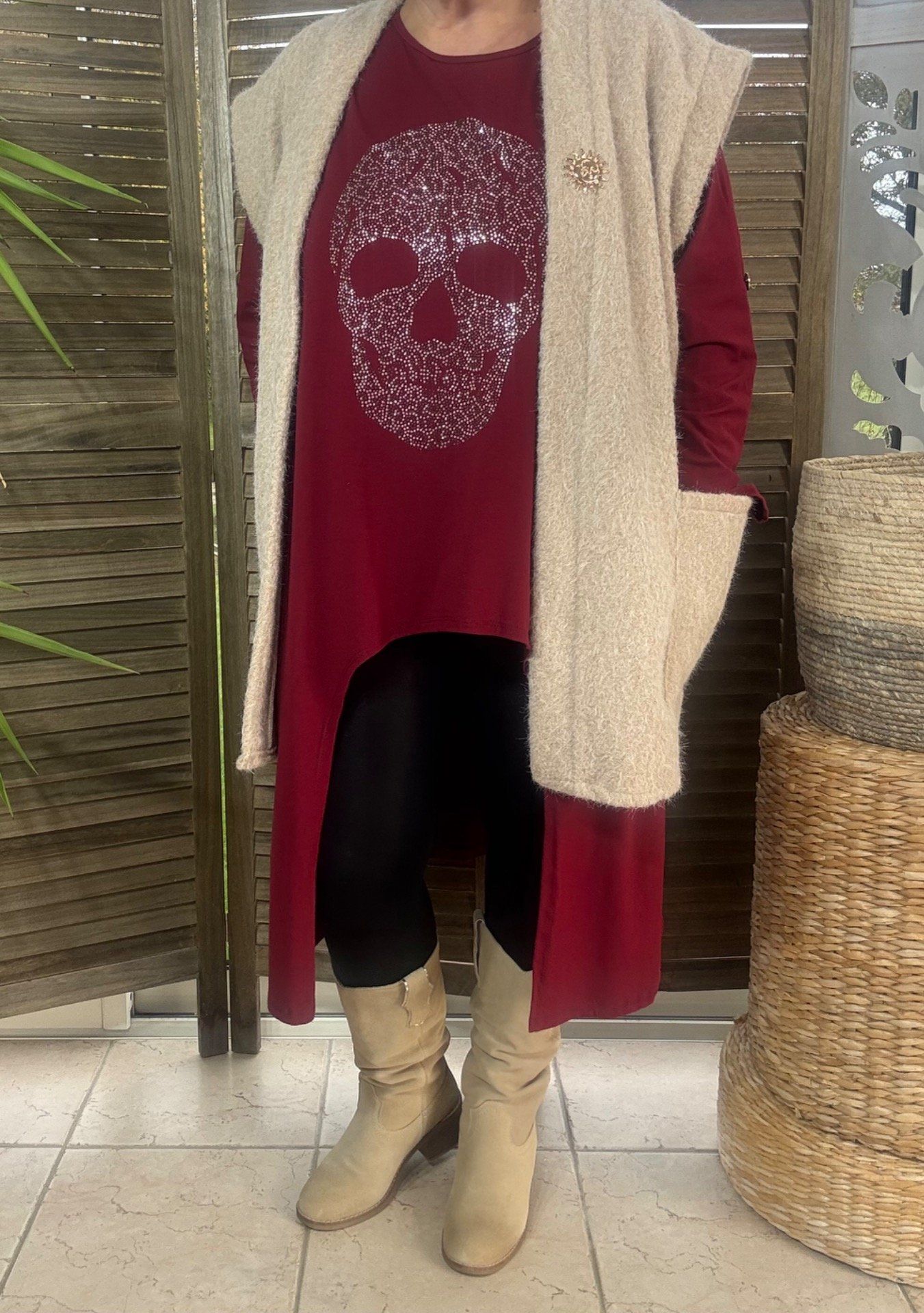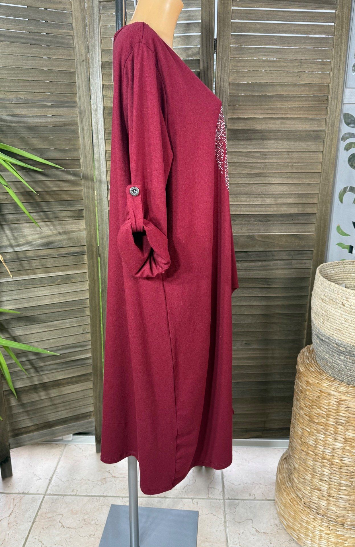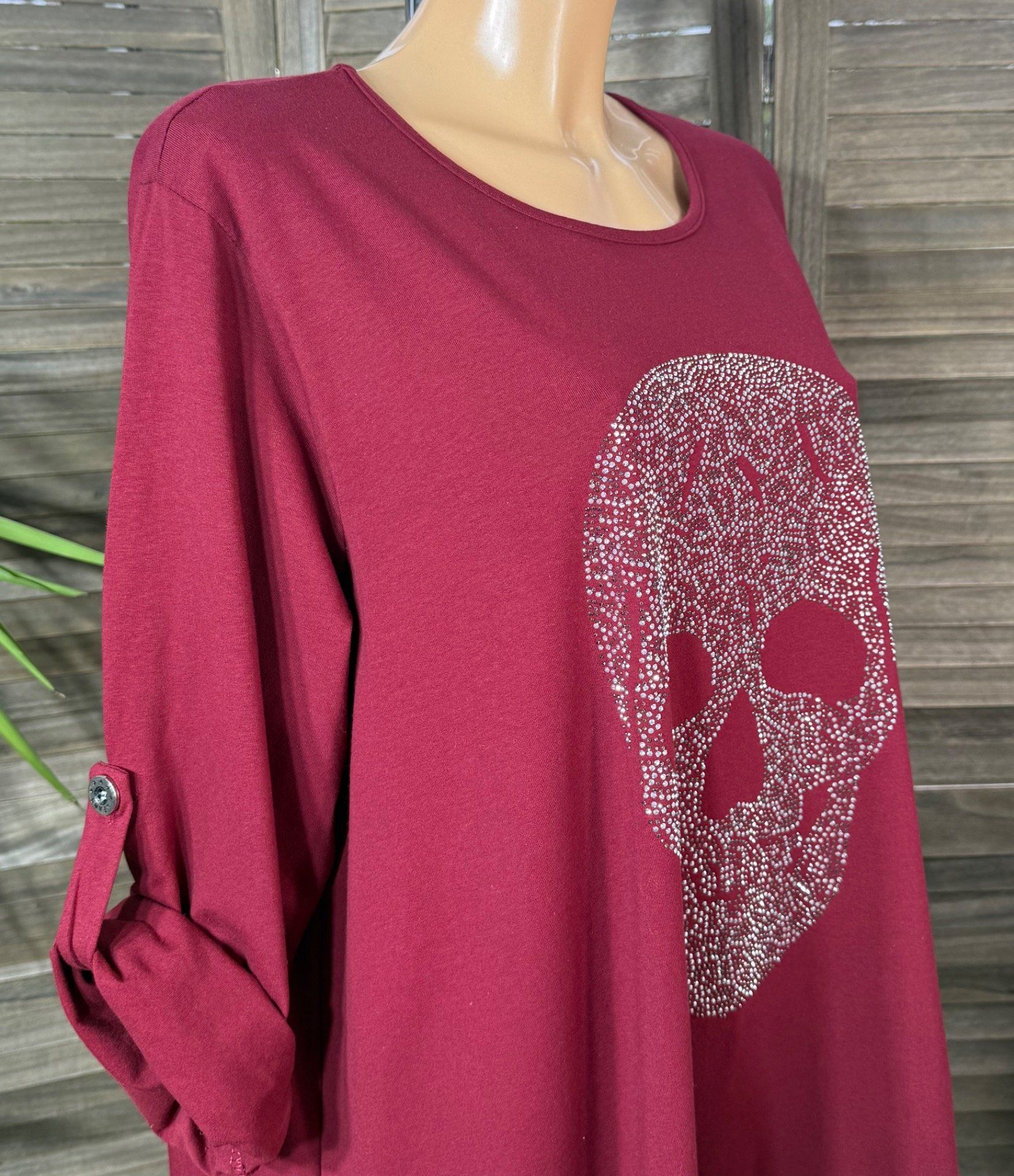 Maxi-tunique asymétrique Bordeaux Mexican Skulls Calavera Strass du 40 au 52