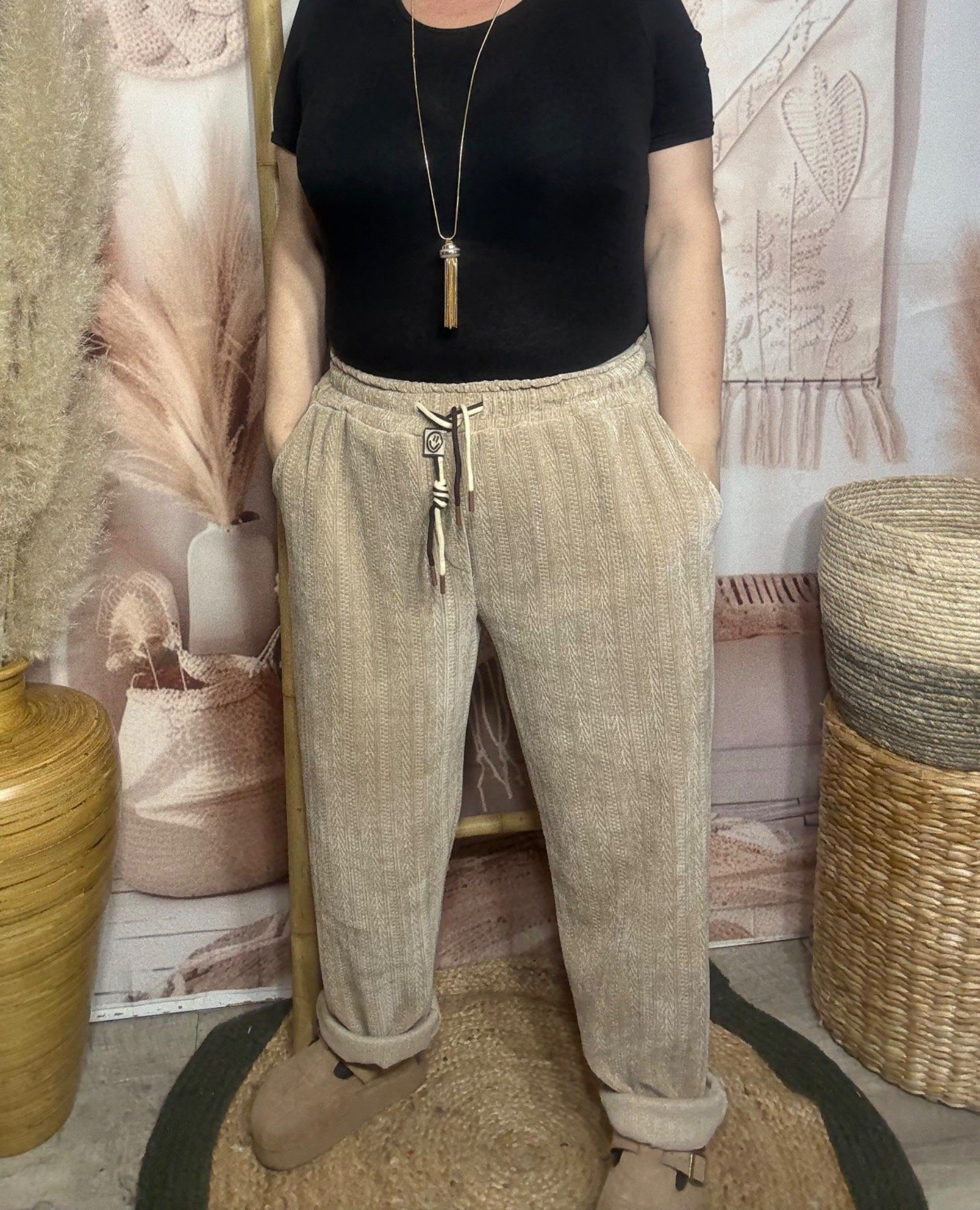pantalon façon jogg velours rayé et motifs texturés camel confort ++++ du 40 au 50/52