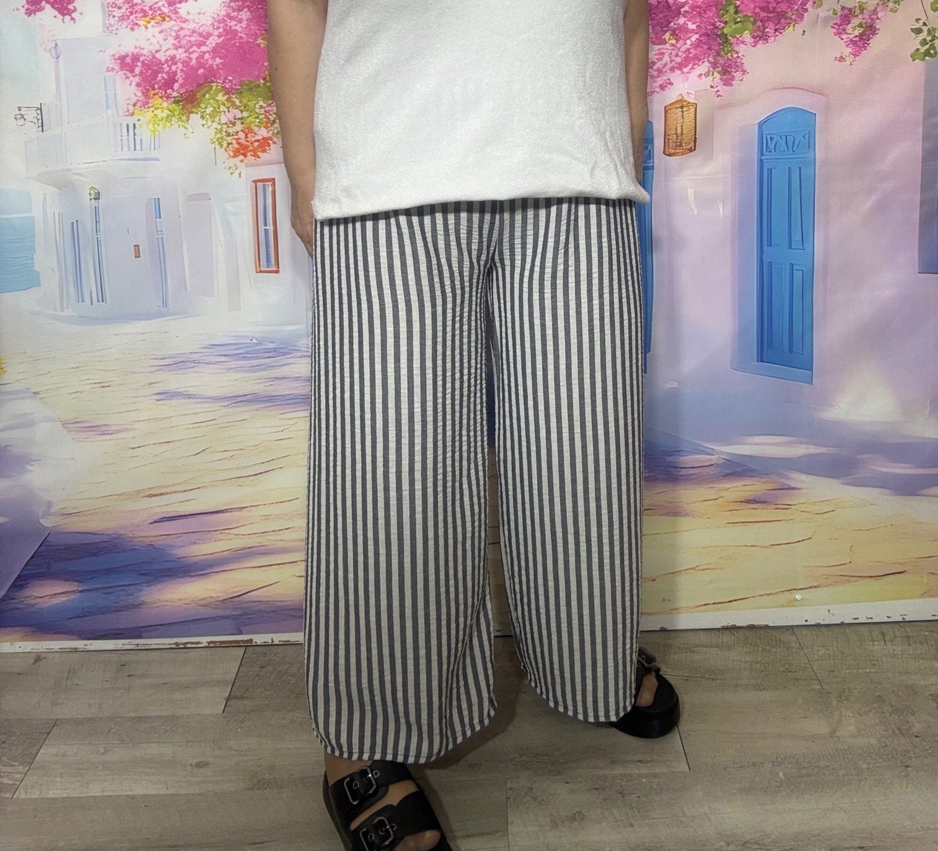 Pantalon palazzo écru rayé noir aspect Lin + ceinture offerte