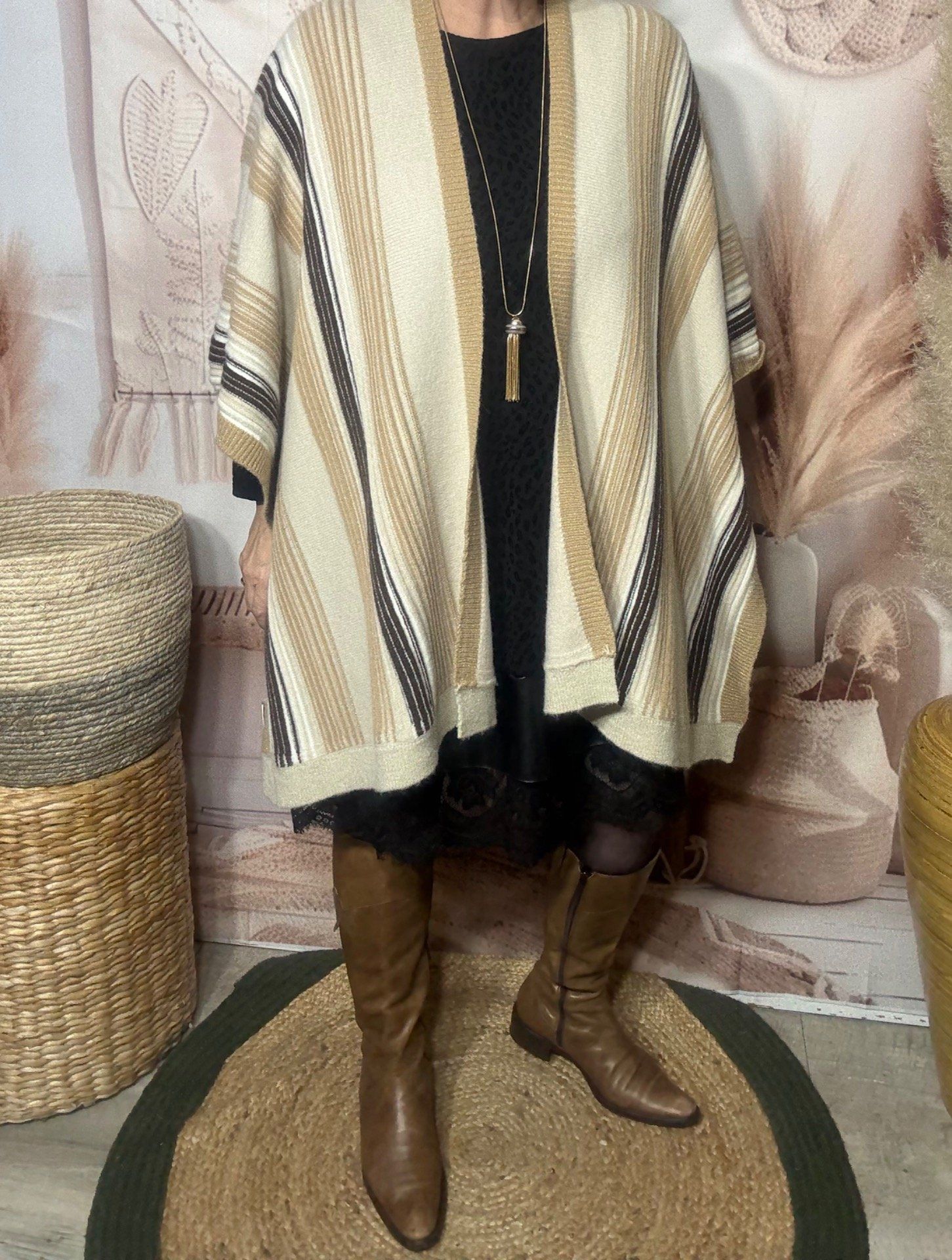 Poncho-veste oversize SANS LAINE rayé beige camel choco lurex doré TOUTES TAILLES