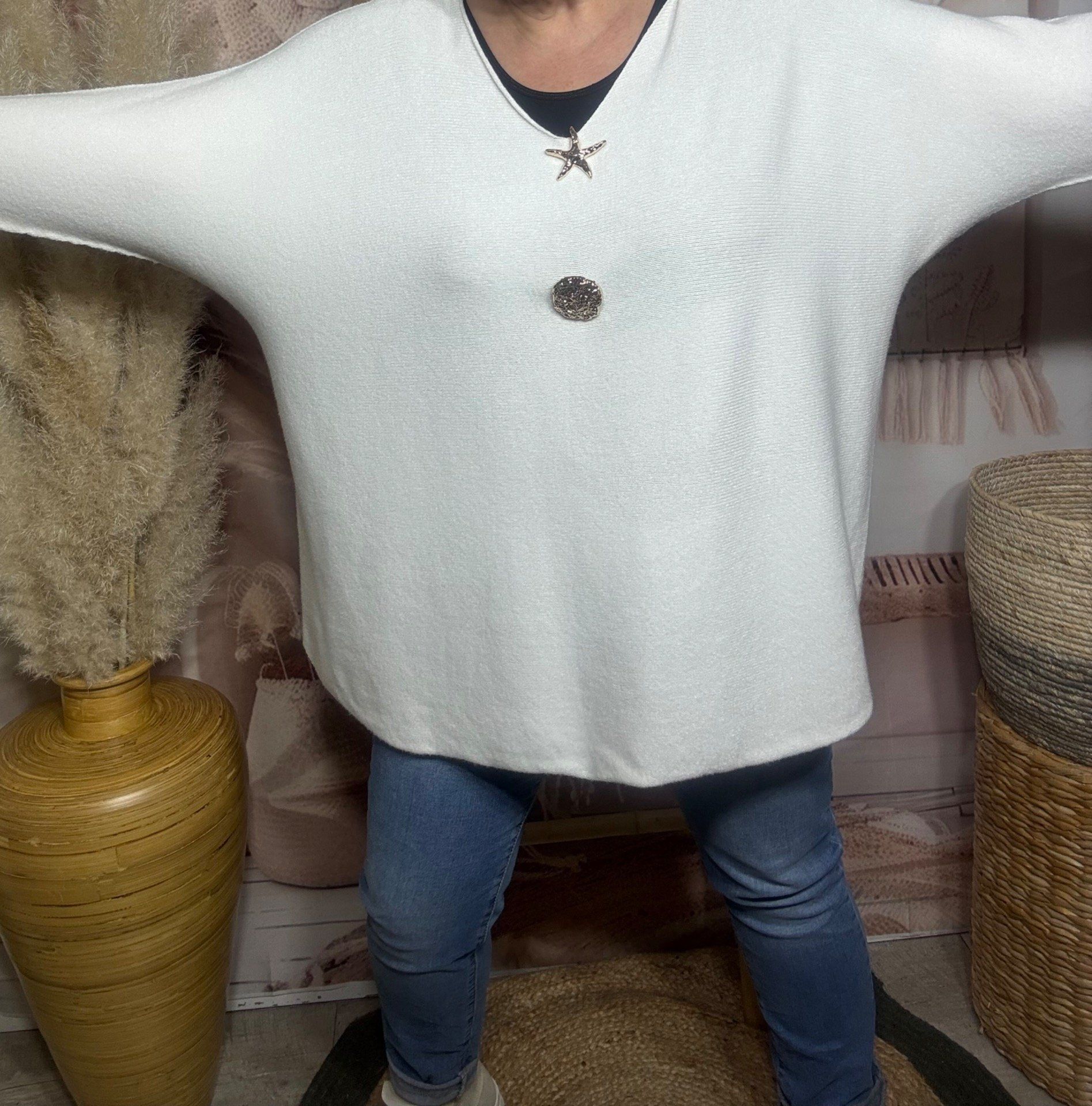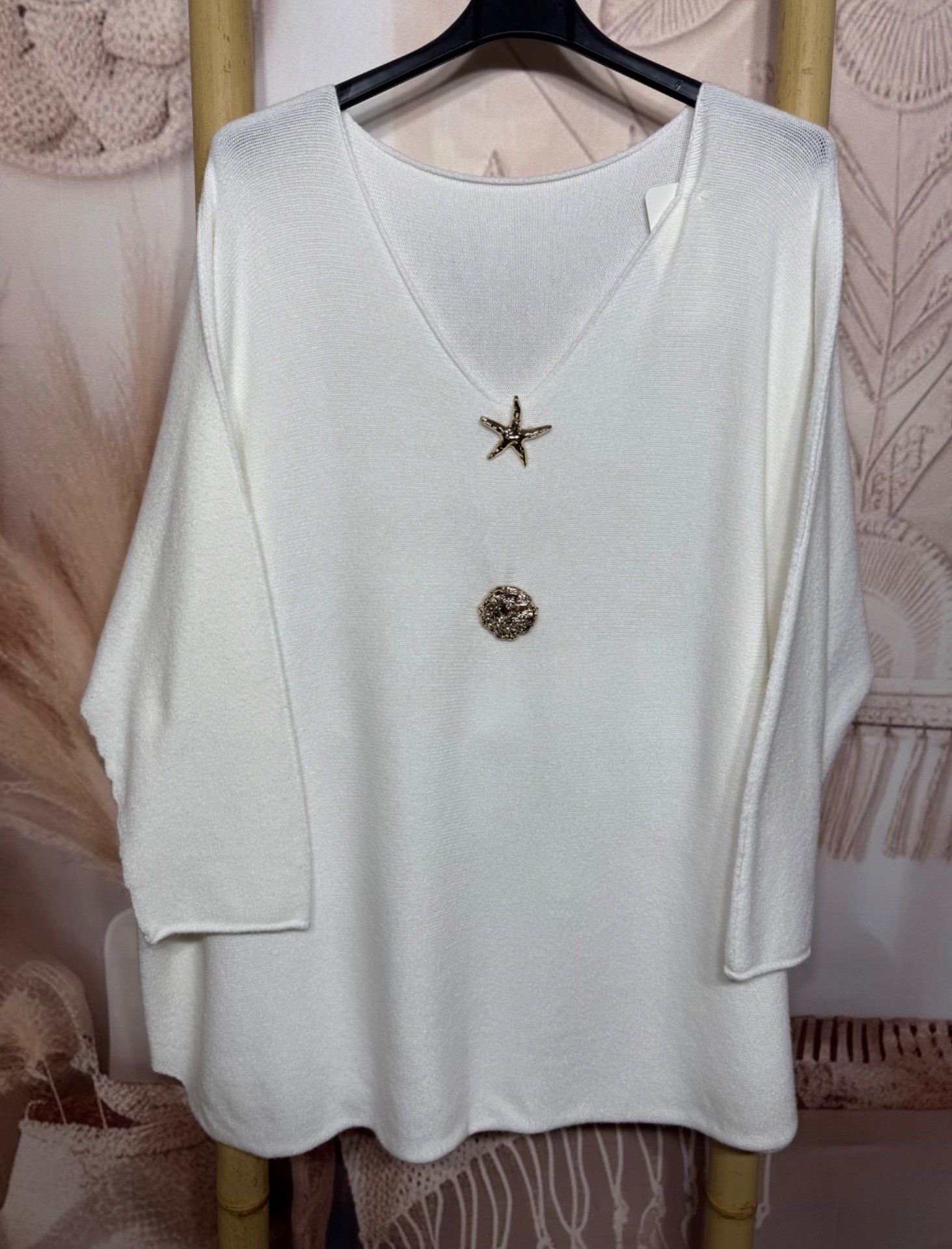 pull ample SANS LAINE blanc col V + 2 broches dorées