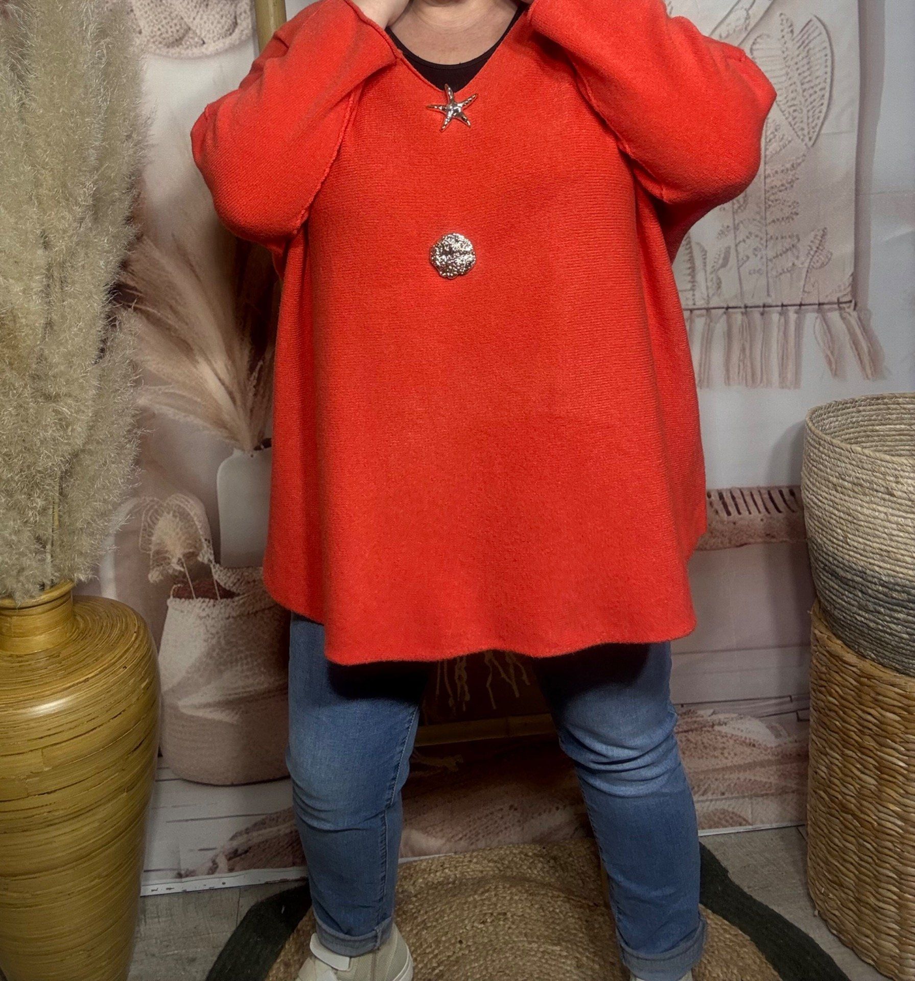 pull ample SANS LAINE orangé col V + 2 broches dorées du 40 au 52