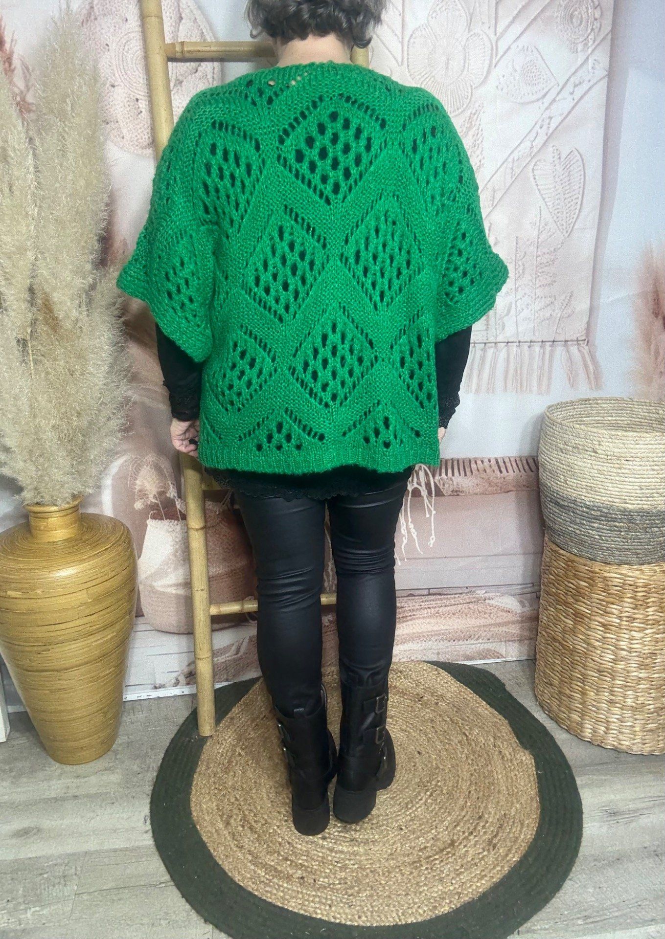 Pull asymétrique ample SANS LAINE maille crochet Bohème vert Gucci douceur ++ du 40 au 52