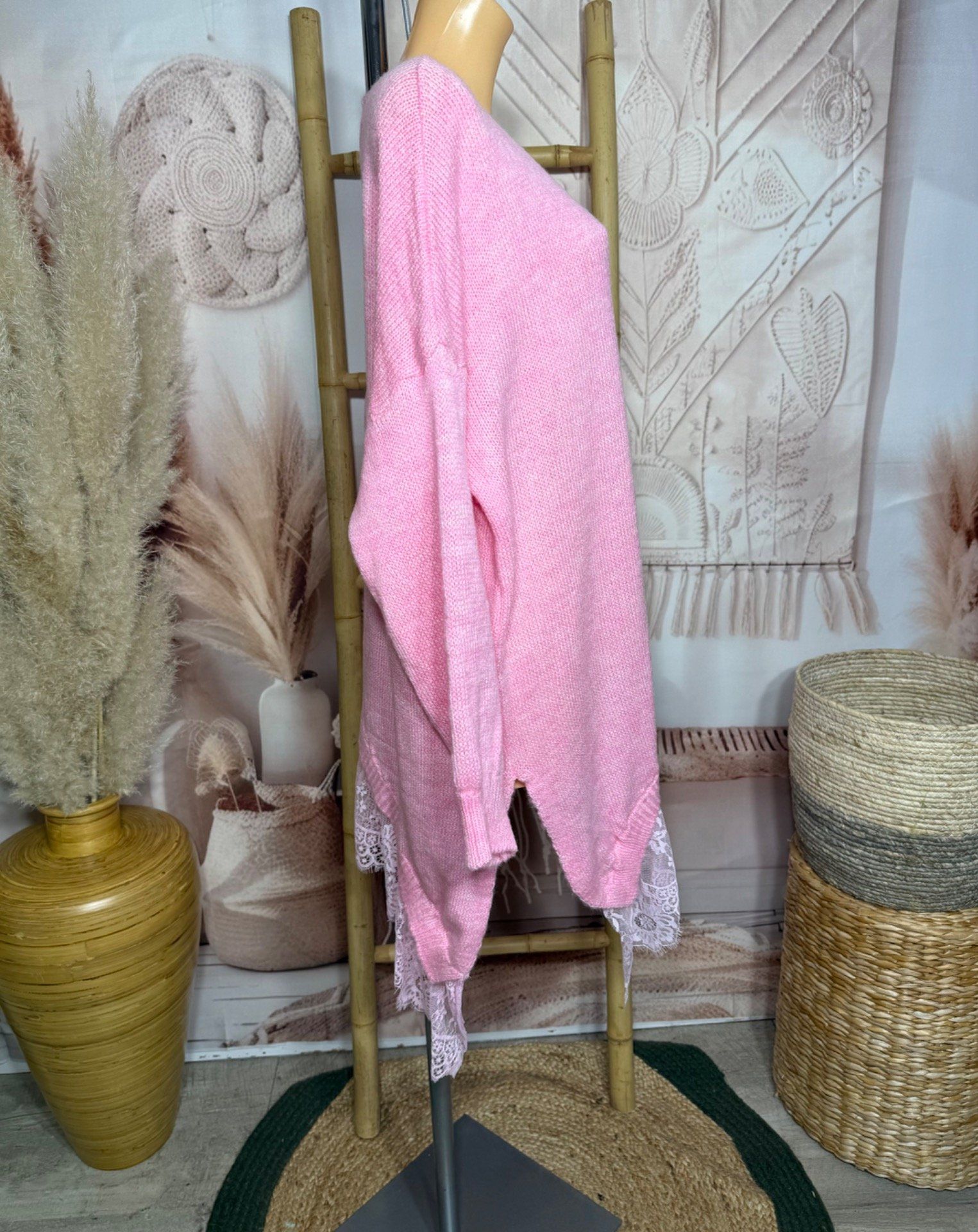 pull asymétrique long rose bonbon col V et dentelle assortie douceur +++ du 40 au 54/56