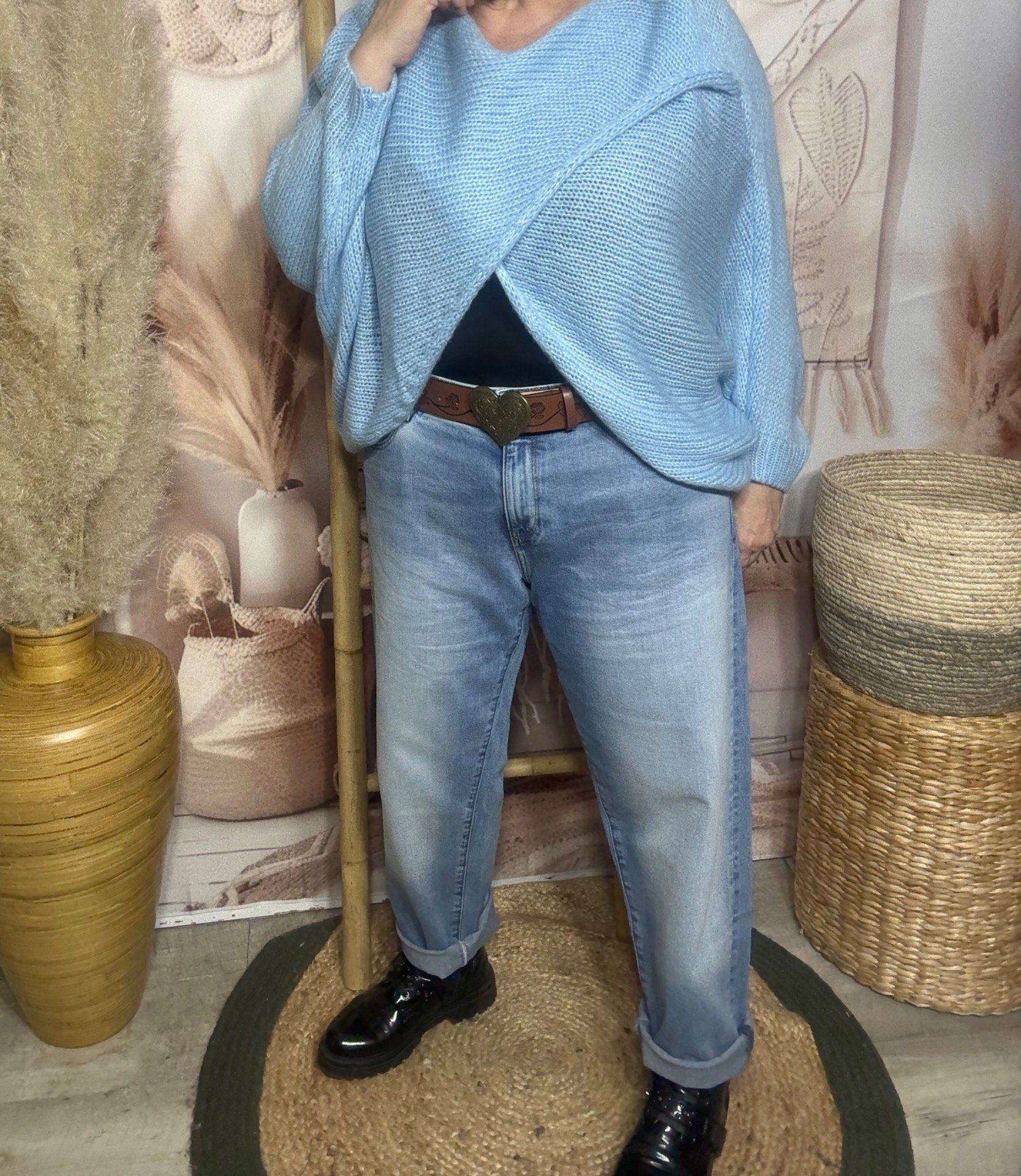 Pull court croisé bleu ciel douceur +++ ou en version "chauffe-épaule"